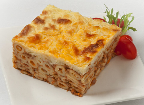 Wyglądem przypomina wspomnianą musakę, ale bakłażan i ziemniaki zastąpione zostają grubym makaronem w kształcie rurek. Ta potrawa to doskonały przykład włoskich wpływów w tutejszej kuchni. Można rzec, że to lasagne w greckiej wersji.