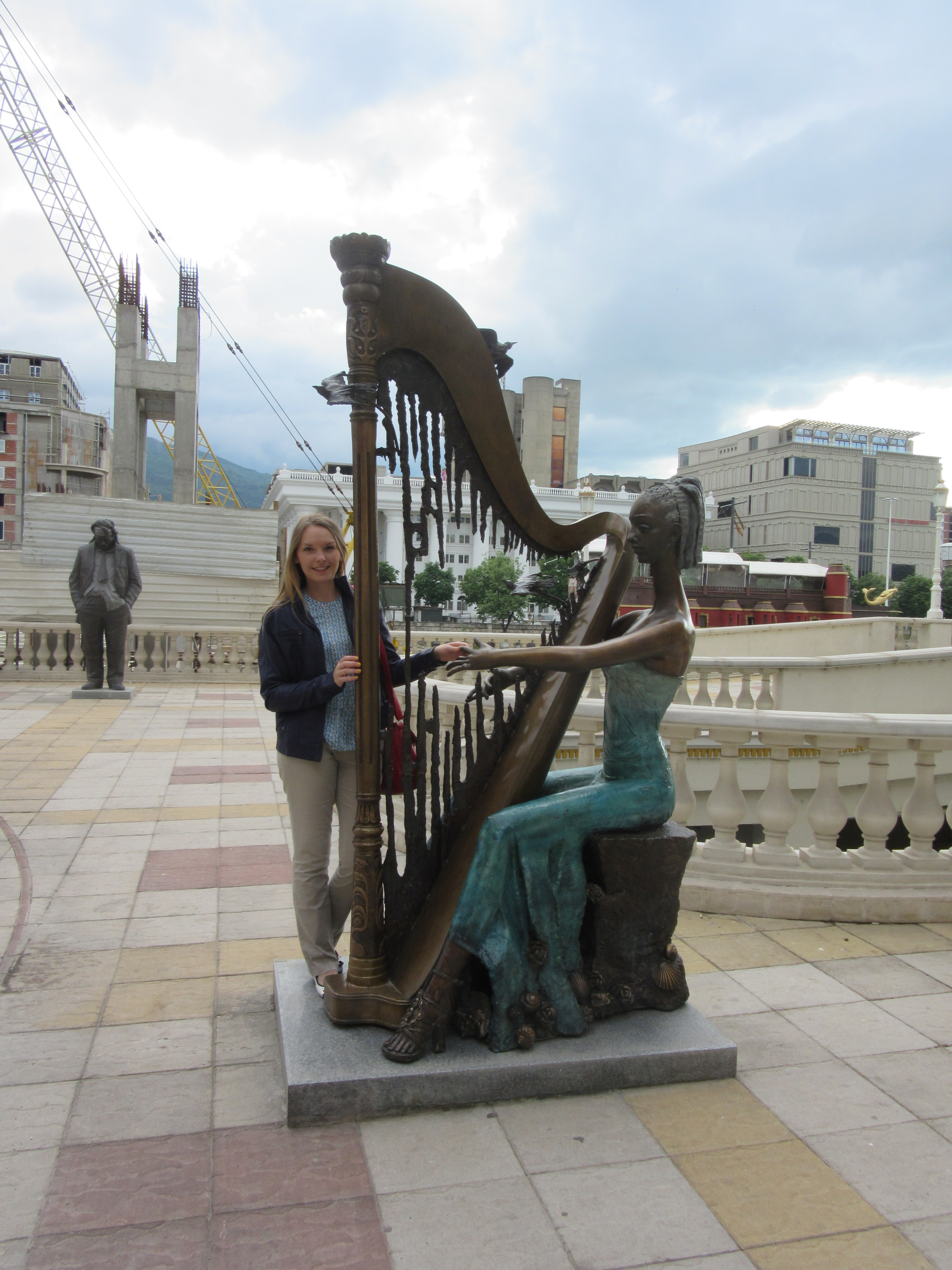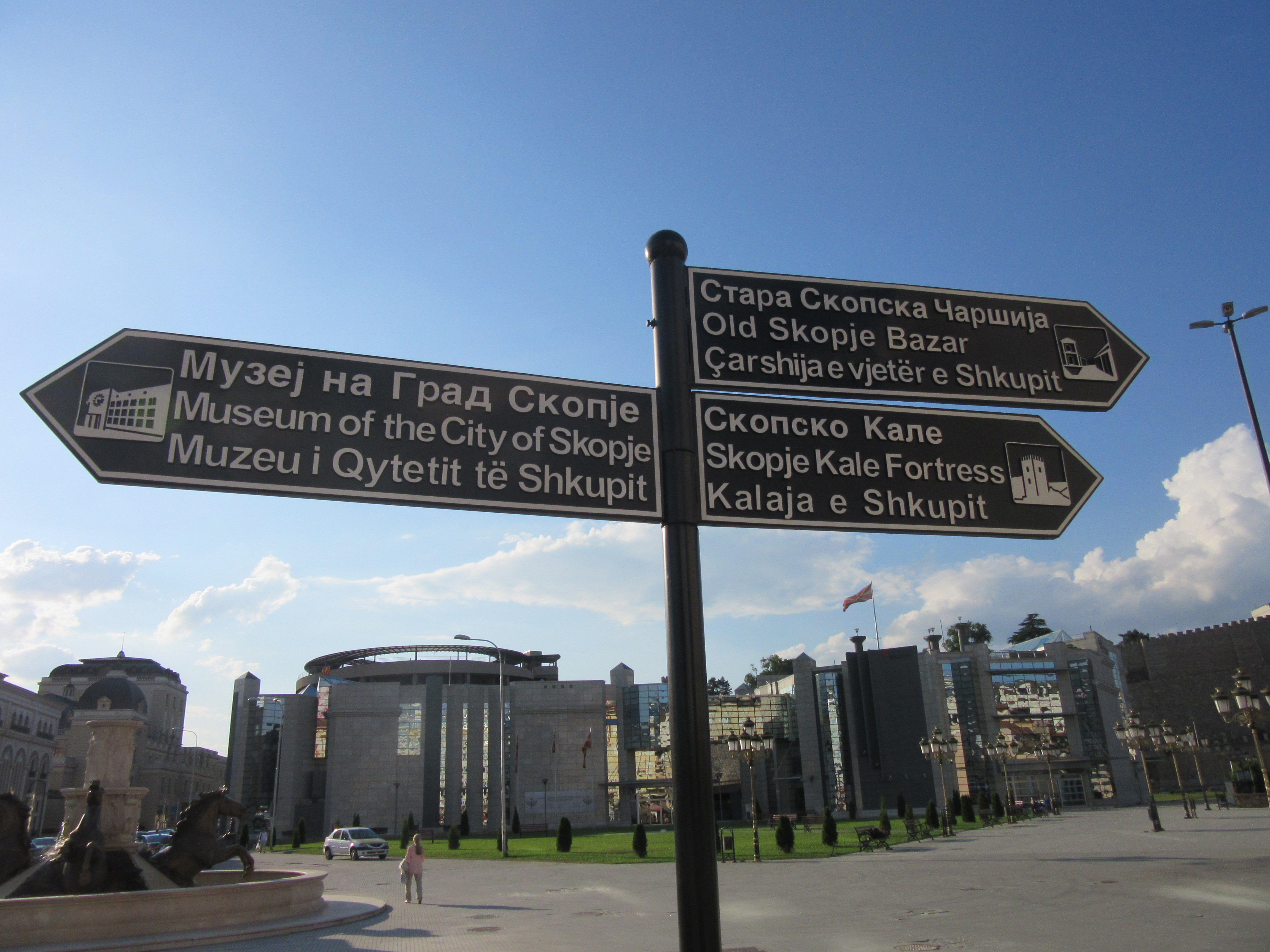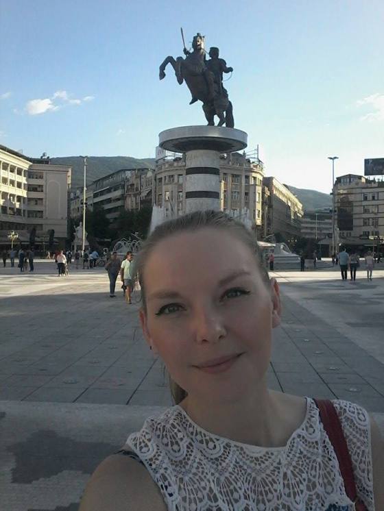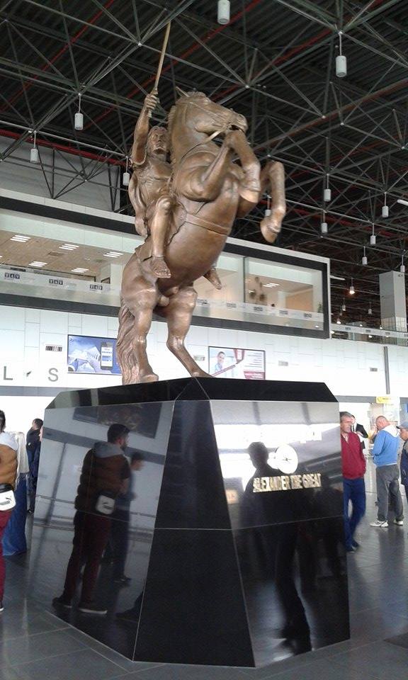 Po wylądowaniu w Skopje wpadłam w lekką panikę. Coś dziwnego stało się z moim operatorem, gdyż nie mogłam połączyć się z siecią i nie mogłam zadzwonić do mamy oznajmić jej, że (na razie) jestem cała i zdrowa. Nigdy nie miałam takiego problemu, zawsze automatycznie mnie przełączało, a tym razem musiałam zrobić to ręcznie. W każdym razie chwile grozy zostały szybko zażegnane 🙂 Już na lotnisku powitał mnie (jeden z wielu) wielki pomnik Wielkiego Wojownika – Aleksandra Macedońskiego 🙂 Jeśli chodzi o postać Aleksandra, to jest on źródłem konfliktu między Macedończykami a Grekami, którzy roszczą sobie prawo do traktowania Aleksandra jako własnego bohatera narodowego. Dlatego fontanna z monumentalną rzeźbą znajdująca się na centralnej części Placu Macedońskiego, oficjalnie nazywa się „wojownik na koniu”, ale wiadomo kogo ona przedstawia. Postanowiono nazwać ją w neutralny sposób, aby nie wzbudzać protestów właśnie ze strony Greków.