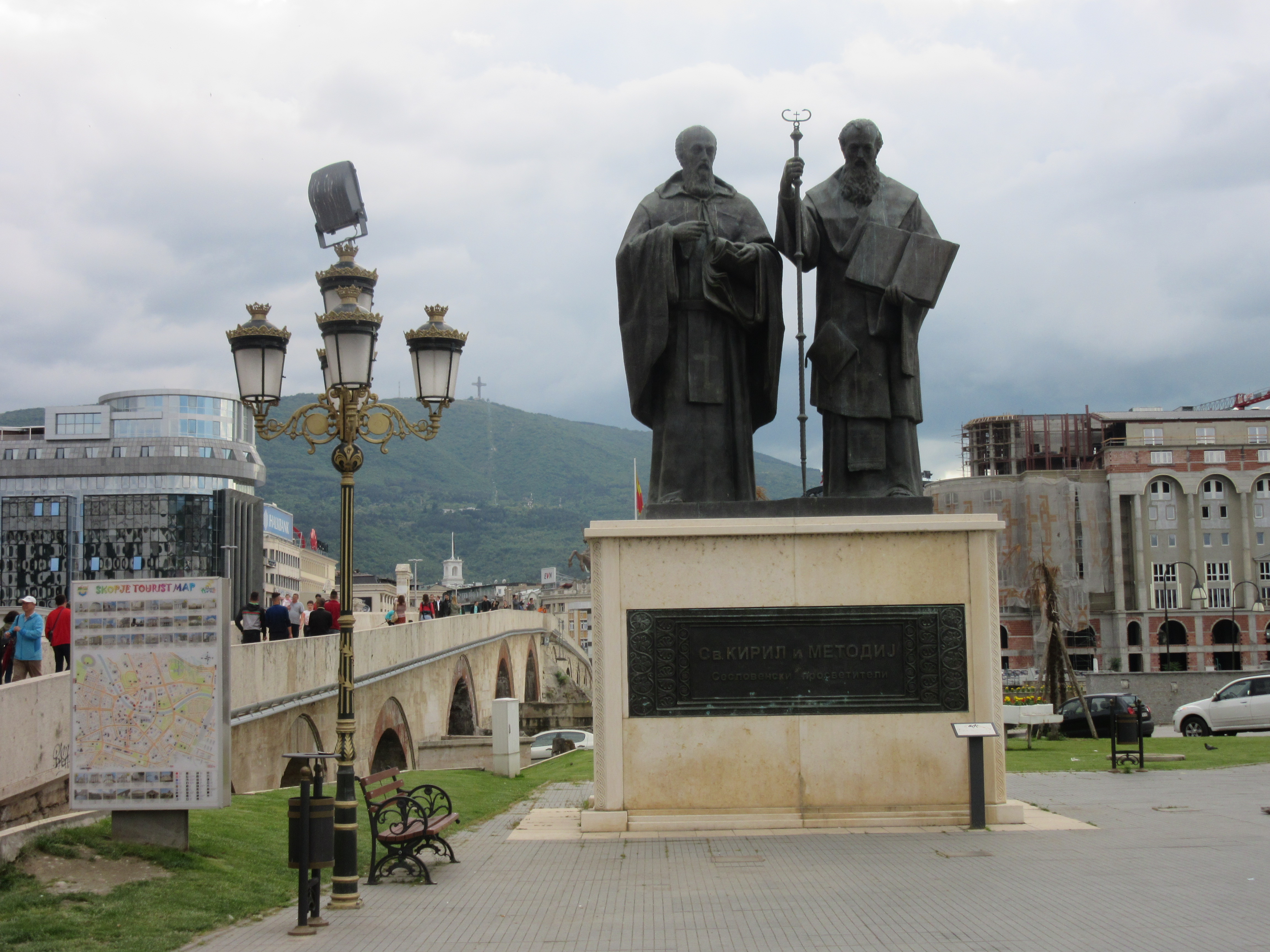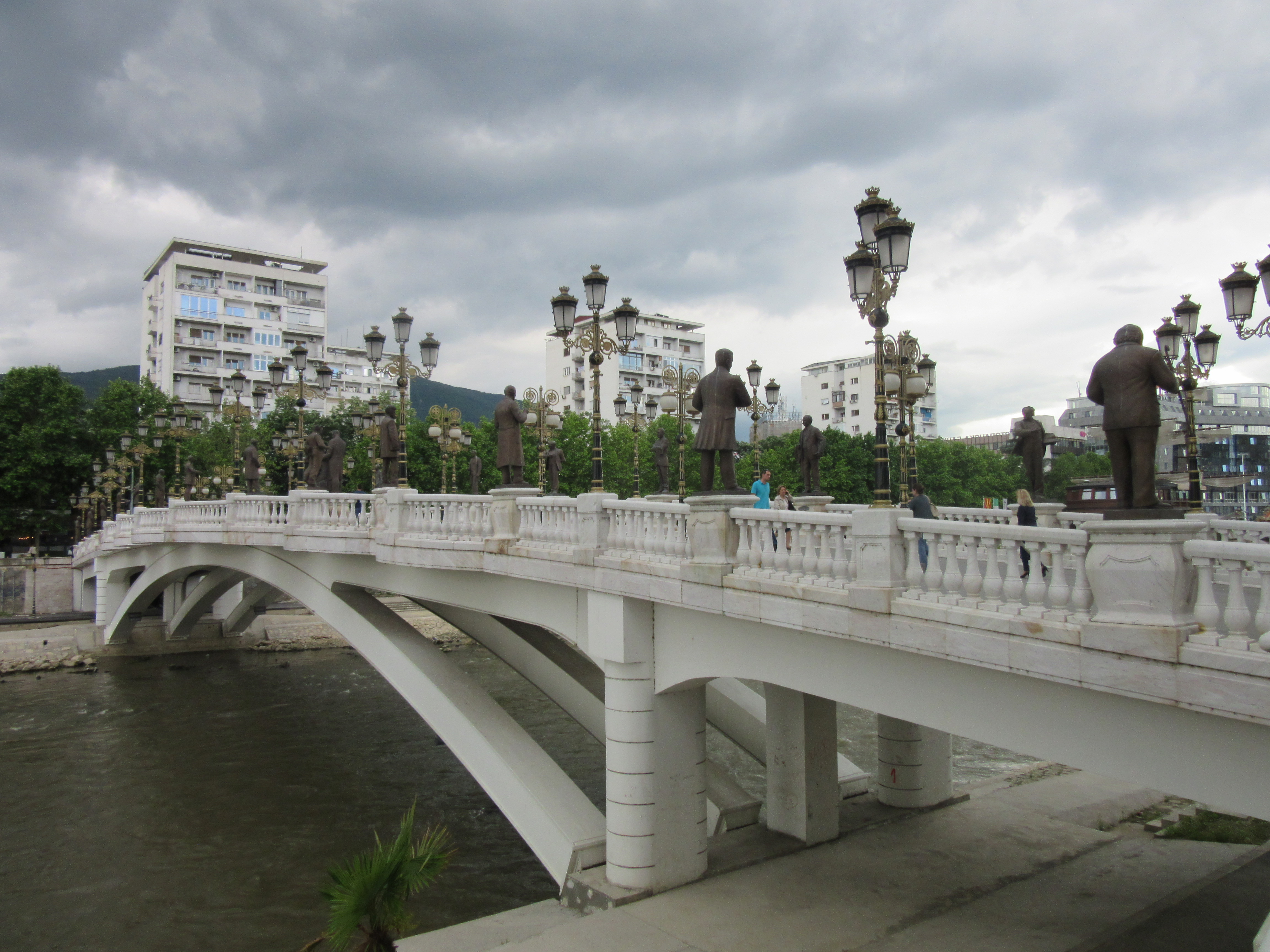 Po drugiej stronie Kamiennego Mostu mija się wielką, nową fontannę z monumentalnymi czterema posągami przedstawiającymi macierzyństwo. Dalej stoi kolejna ogromna rzeźba wojownika – Filipa II, ojca Aleksandra Macedońskiego.