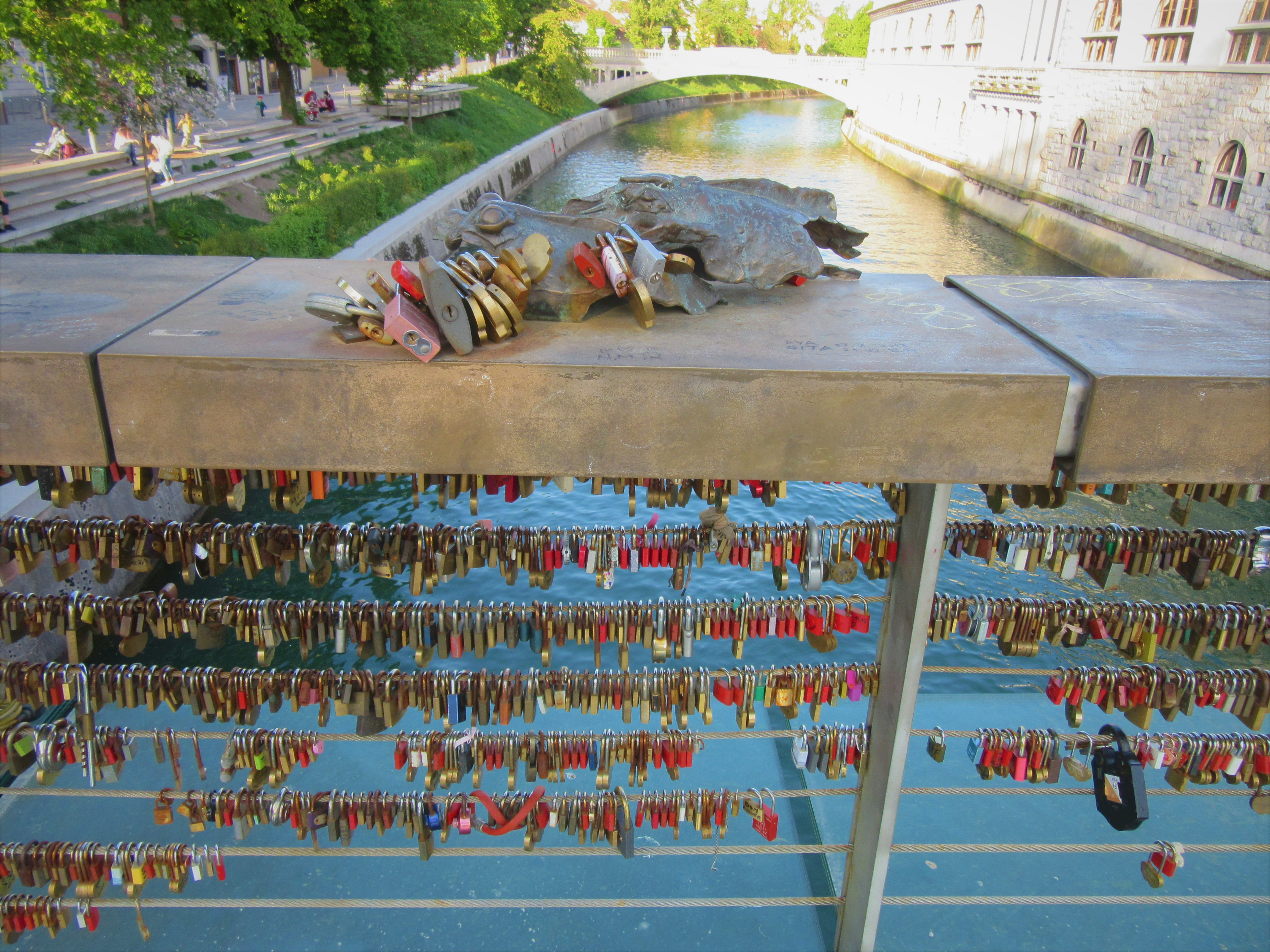 Po obu stronach rzeki rozciąga się kilka mostów. O smoczym mocie już wspomniałam, ale jest jeszcze inny, równie interesujący: Most Rzeźników, który … stał się symbolem zakochanych 🙂 Kłódki symbolizujące większe lub mniejsze miłości zdobią stalowe linki barierek. Co więcej, tuż obok znajdują się nieco dziwne rzeźby przedstawiające sceny z Biblii oraz mitologii greckiej.