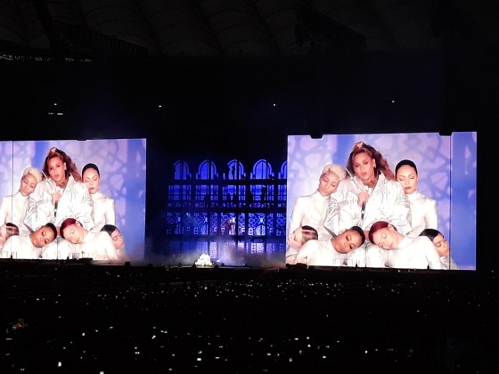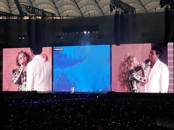 Występ zaczął się od krótkiego wideo promującego trasę. Potem wielokrotnie jeszcze mogliśmy obejrzeć  tego typu filmiki, z jednej strony w gangsterskim klimacie, a z drugiej obserwowaliśmy sielankę w rodzinnym gronie. „Raper and the Queen” – jak się przedstawili na jednym z nich – rozpoczęli występ zjeżdżając windą na scenę piosenką „Holy Grail”. Przez całe show towarzyszyło im mnóstwo tancerzy (głównie w trakcie występów Beyonce) kolorowa i dynamiczna oprawa sceniczna, a nawet ruchoma scena, która co jakiś czas przesuwała się w głąb, na środek stadionu. Co ciekawe, na sam koniec występu, Beyonce nie mogła zejść po drabinie z tej sceny, która znajdowała się właśnie na środku  🙂 Mała wpadka na koniec na pewno nie przyćmi całego koncertu.