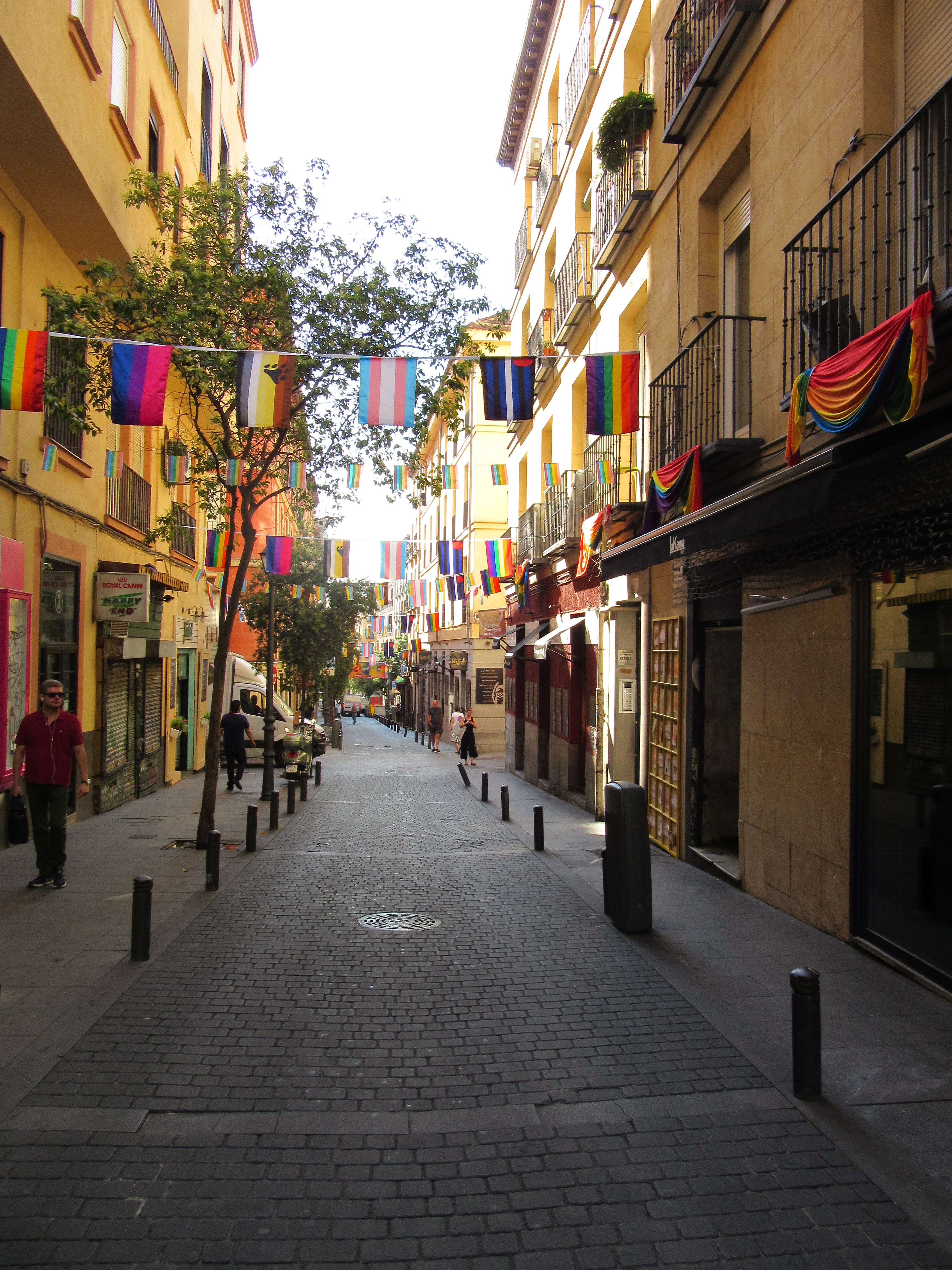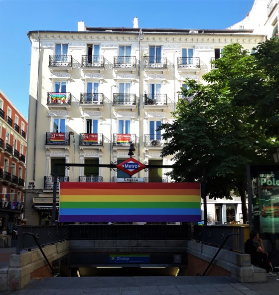 Podczas poprzednich moich wizyt w Madrycie zawsze zatrzymywałam się u znajomych, gdzieś z dala od centrum miasta. Tym razem trafiłam do dzielnicy Chueca, która uznawana jest za dzielnicę… LGBT. Moje zdziwienie było przeogromne, gdy wyłoniłam się z metra na powierzchnię. Niczego nieświadoma, krocząc w nocy prze dzielnicę, wszędzie widziałam kolorowe flagi wiszące dosłownie w każdym oknie, na każdym balkonie. Jak się okazało, dwa dni wcześniej odbyła się tutaj parada Orgullo, która ma zupełnie inny charakter niż ta w Polsce. Poza samym przemarszem odbywają się liczne koncerty i imprezy towarzyszące, na których pojawiają się również skrajni hetero 🙂 Miasto po prostu wtedy żyje pełną piersią. Dwa dni po fiesta nadal trwała. Tłumy imprezujących Hiszpanów zalały każdy bar czy restaurację. Bardzo chciałam do nich dołączyć, ale zmęczenie po całym dniu w podróży wygrało z chęcią wspólnej integracji 🙂