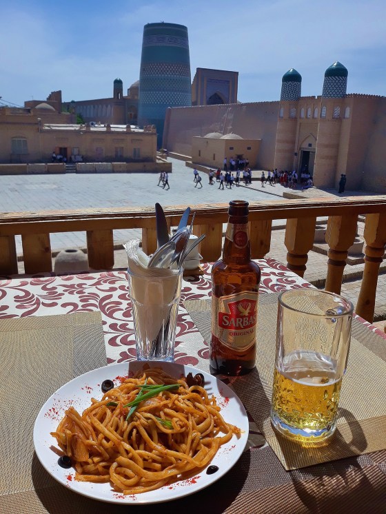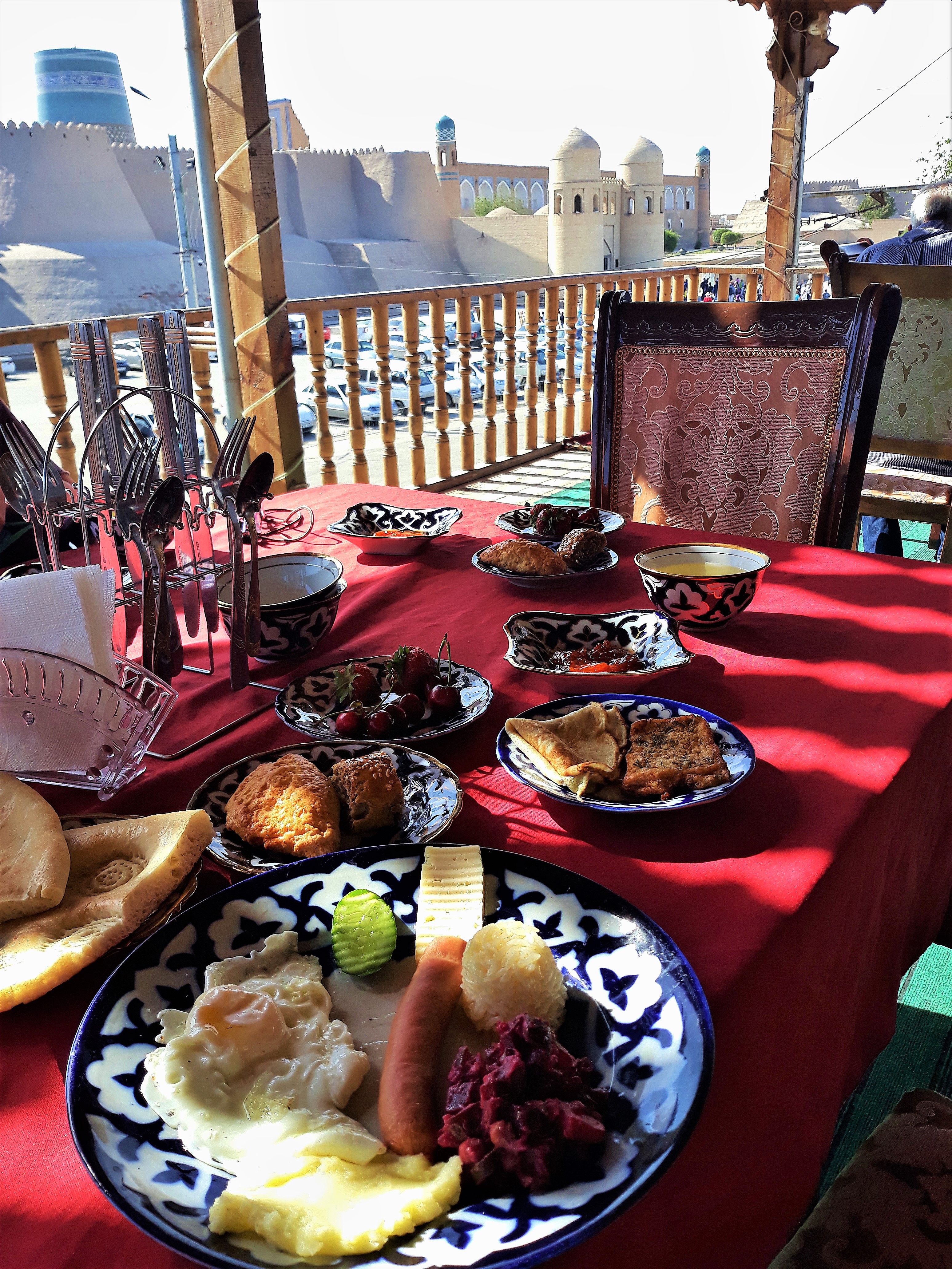 Będąc w podróży zawsze próbuję lokalnej kuchni i tradycyjnych produktów. Tak również było i w tym przypadku. Kuchnia uzbecka obfituje w grillowane mięso, tłuste makarony noodle oraz (ku mojemu zaskoczeniu) różnego rodzaju pierogi. Nie mówię, że jedzenie było niedobre, wręcz przeciwnie, jednak taka ilość tłuszczu dała się we znaki mojemu organizmowi. Już po trzech dniach mój żołądek wołał o coś lekkostrawnego, a pod koniec wyjazdu jadłam już tylko sałatki warzywne 🙂 Za to śniadania były przepyszne, „na bogato”, a te z widokiem na miasto smakowały najlepiej 🙂