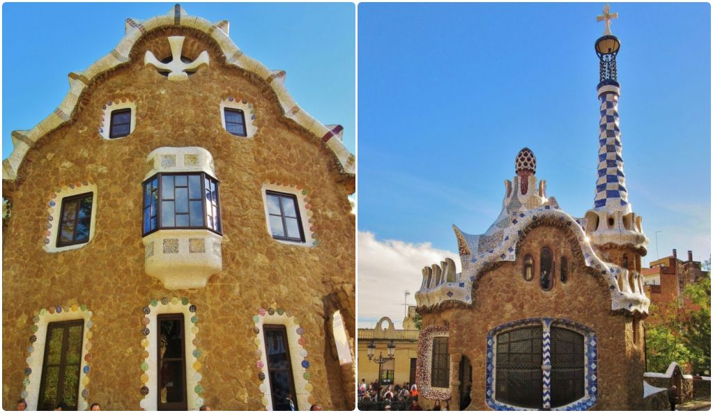 Innymi, niemniej charakterystycznymi elementami  Parku Güell są „piernikowe” chatki, które wyglądają niczym żywo wyjęte z jakiejś bajki. Zostały one wzniesione w latach 1901-1902. Niegdyś stanowiły one najważniejszą część całego obiektu, czyli główną bramę wejściową z bocznymi pawilonami. Aktualnie znajdują się w nich dom portiera (ten z dachem w kształcie grzyba) oraz ten zwieńczony czteroramiennym krzyżem to księgarnia i sklep z pamiątkami. Co ciekawe, krzyż ten wskazuje cztery główne strony świata. Zniszczono go w 1936 roku w trakcie wojny domowej, ale po jej zakończeniu został odbudowany.