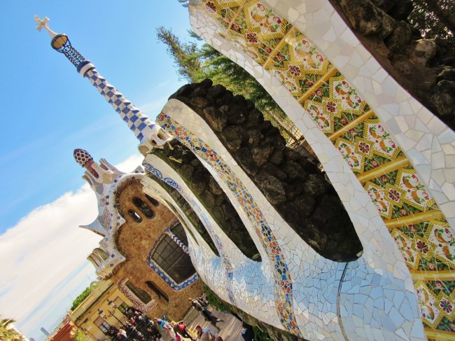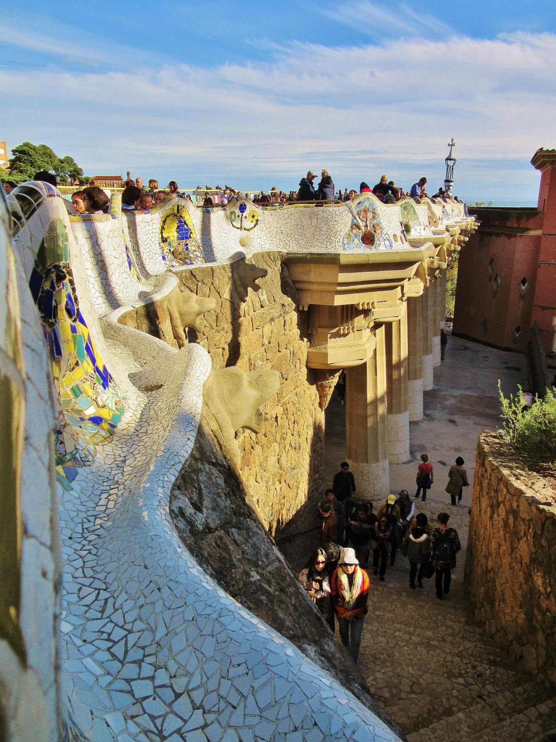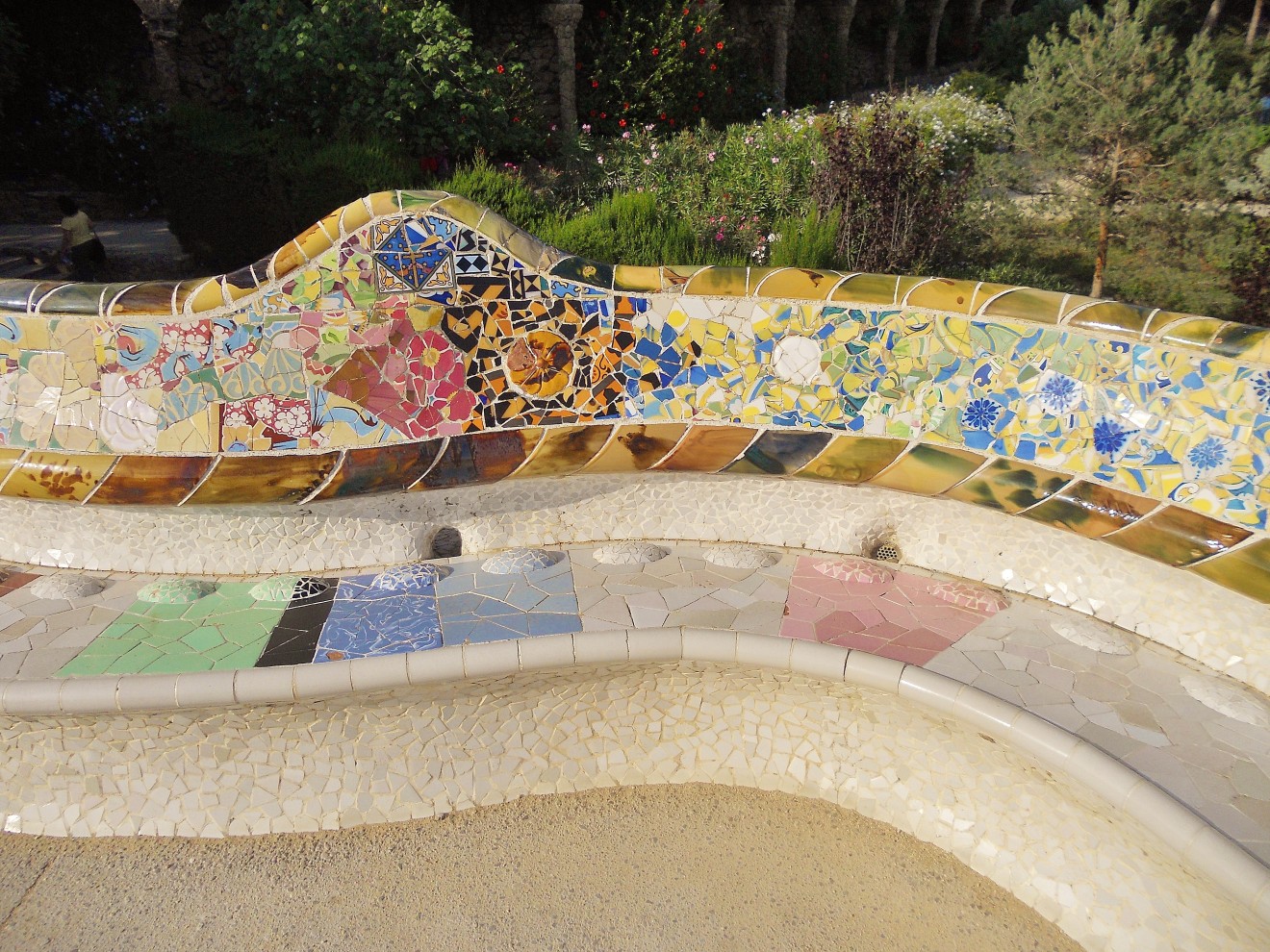 Założeniem Gaudiego było stworzenie miejsca, w którym architektura i natura zespoli się w jedną całość. Każdy, kto przebywał na terenie Parku Güell doskonale rozumie, co architekt miał na myśli. Na szczególną uwagę zasługuje tam wiele miejsc i elementów. Jednym z nich jest słynny taras widokowy z panoramą Barcelony oraz najdłuższą i najbardziej kolorową ławką świata. Wijąca się niczym wąż ławka mierzy 110 metrów i jednocześnie może pomieścić aż 200 osób! Została ona zaprojektowana w taki sposób, by każdy, kto na niej siedzi miał swoją prywatną przestrzeń. Kolory i kształty małych kawałeczków ceramiki  w głównej mierze rozmieszczone są w sposób przypadkowy, ale jest w tym pewna logika. Przyglądając się dokładniej, można dostrzec znaki zodiaku, gwiazdy, ryby, kwiaty i motywy religijne. Dominujące są trzy kolory: niebieski, zielony i żółty, które dla Gaudiego oznaczały wiarę, nadzieję i miłość. Taka metoda układania stłuczonych kawałków ceramiki w jednolitą całość nazywa się trencadis.