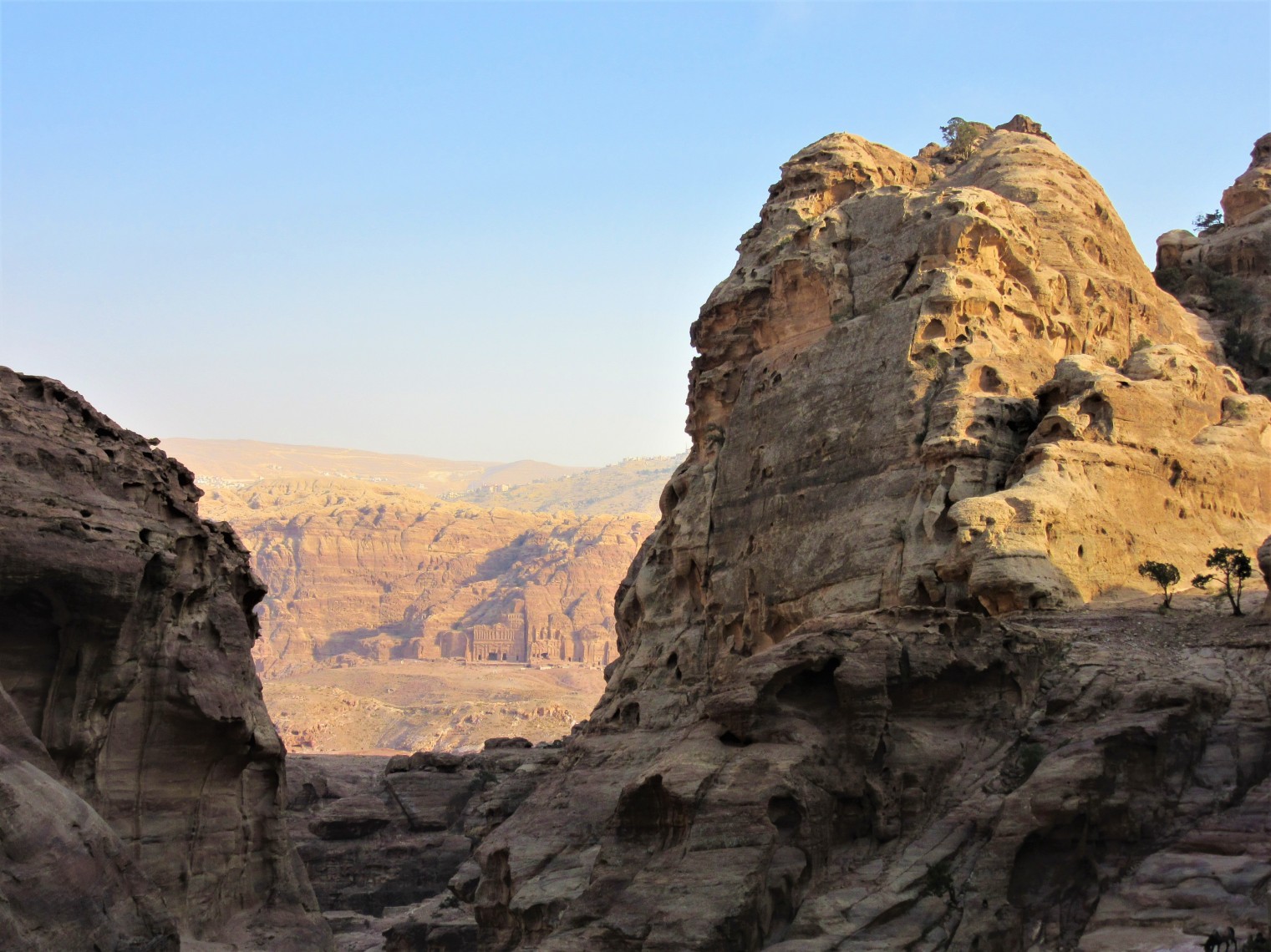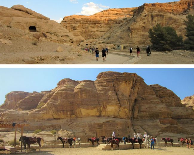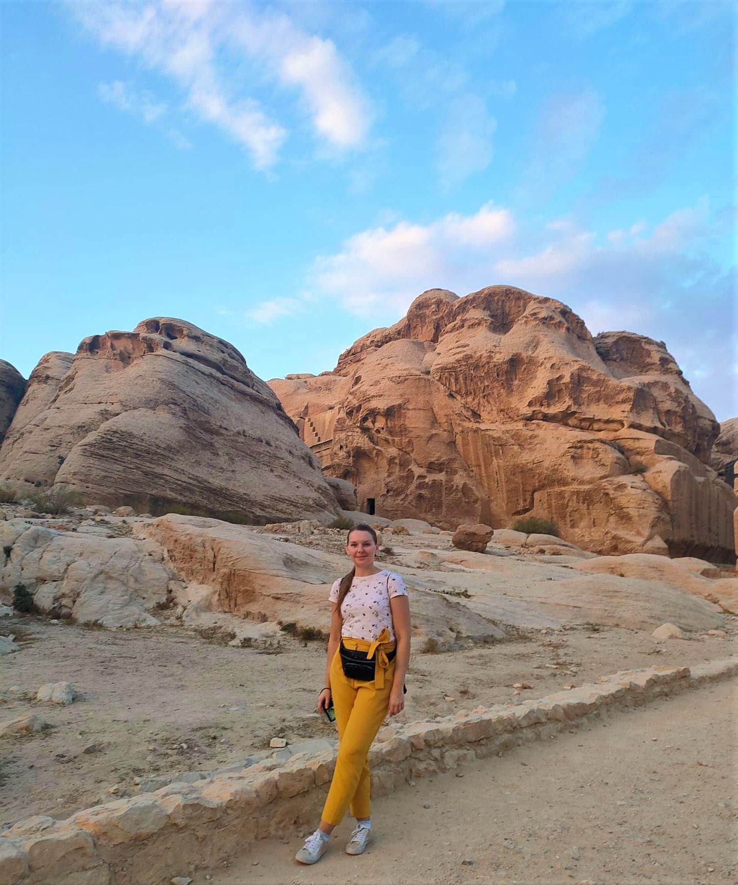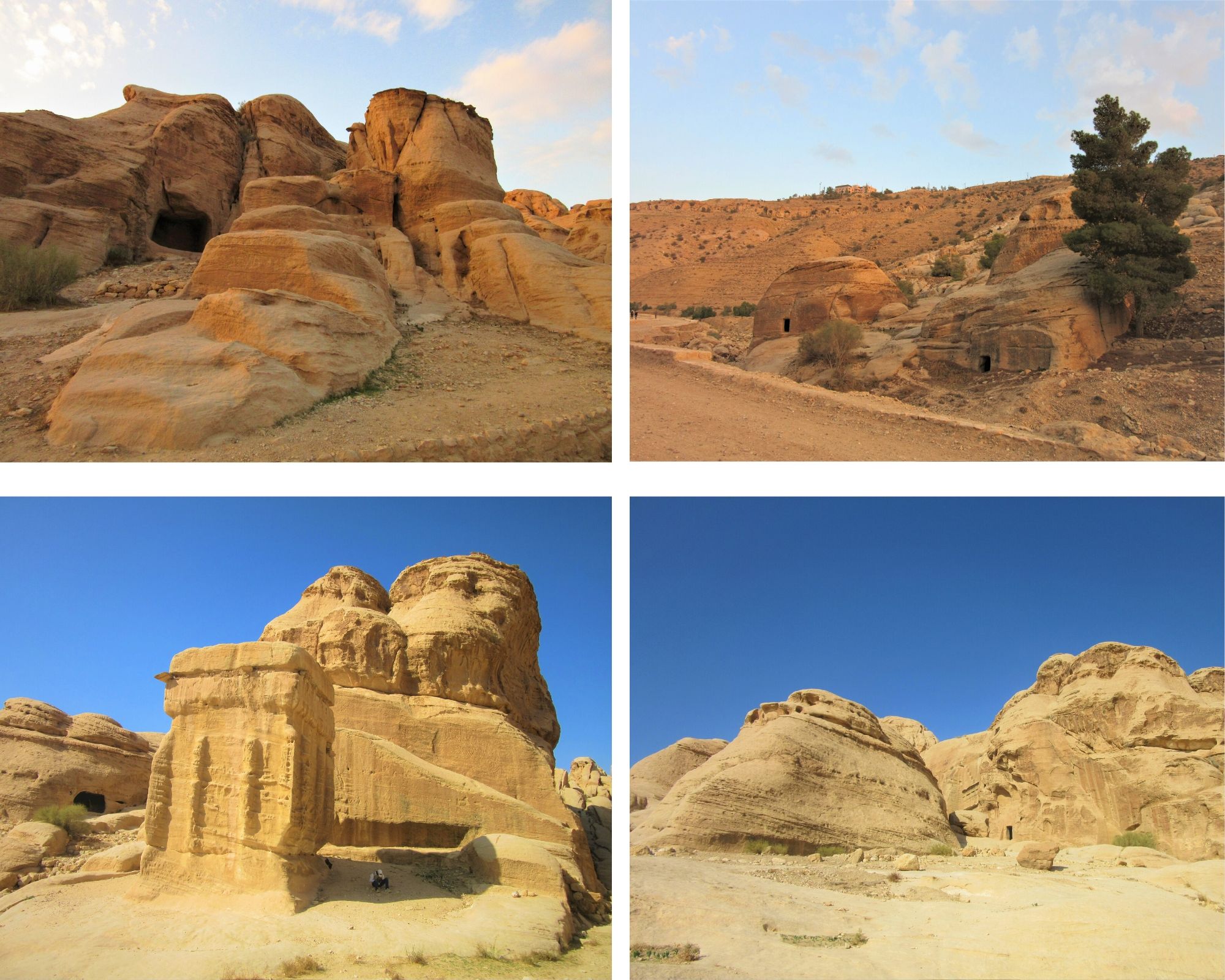 Już na samym początku naszej wędrówki przenosimy się na… Księżyc. Tak, tak – dobrze czytacie. Wszystkie formacje skalne przypominają powierzchnię tej ziemskiej satelity (nie żebym tam była).  A pośród nich widnieje Grobowiec Obelisków oraz poniżej Triclinium, czyli wykute w skale pierwsze grobowce Nabatejczyków pochodzące z I w. n.e. Znajdują się tam bloki skalne wyraźnie obrobione ręką człowieka. Widać na nich cztery kamienne piramidy, a poniżej wnękę, w której spłonęło niegdyś pięć osób. Te foremne prostopadłościany to tzw. dżiny (w języku arabskim słowo to oznacza duchy), które mogą symbolizować ołtarze bóstw nabatejskich.