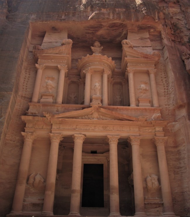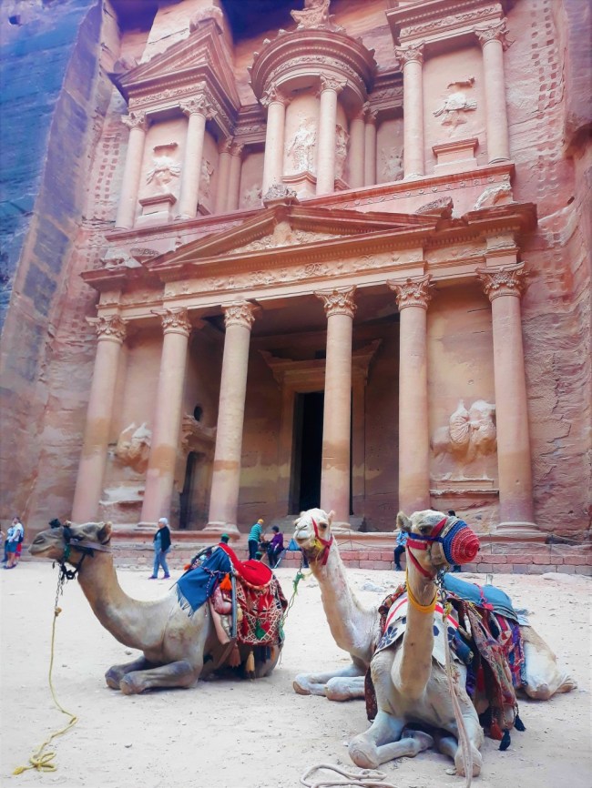 Na końcu dróżki biegnącej przez wąwóz, nieśmiało zza szczelin skalnych wyłania się najpopularniejsza budowla w Petrze, TA hipnotyzująca budowla – Skarbiec Faraonów. To chyba najbardziej obfotografowane miejsce w całej Petrze. Wysoka na 40 metrów fasada udekorowana jest korynckimi kolumnami, frazesami i licznymi figurkami. Wbrew pozorom ten imponujący wykutą w skale fasadą grobowiec nie ma nic wspólnego z władcami starożytnego Egiptu. Według jednej z beduińskich legend, w środku znajduje się ukryty złoty skarb jednego z faraonów. Niestety nie było mi dane to sprawdzić, ponieważ wstęp był zakazany 😦 Pomimo tłumu turystów, leżakujących po środku wielbłądów i agresywnie nagabujących Beduinów, byłam w siódmym niebie. W końcu ziściłam swoje marzenie, w końcu poczułam się jak Indiana Jones. Większość turystów kończy swoją wędrówkę właśnie przy Skarbcu. My jednak głodne wrażeń i kolejnych zachwytów, poszłyśmy dalej. Co  jeszcze na nas czekało?