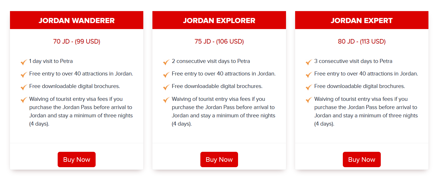 Generalnie Jordania jest droga (dla przypomnienia: 1 JOD= ok. 5,6 zł). Również sam wstęp do Perty jest drogi, ale zapewniam Was – wart każdej ceny 🙂 Najbardziej opłaca się kupić Jordan Pass, który poza wizą do kraju, zawiera także wejściówki do 40 atrakcji w całym kraju, w tym również do Petry. Cena za Jordan Pass uzależniona jest od tego, ile dni chcemy spędzić w samej Petrze: