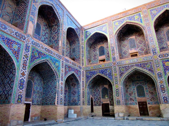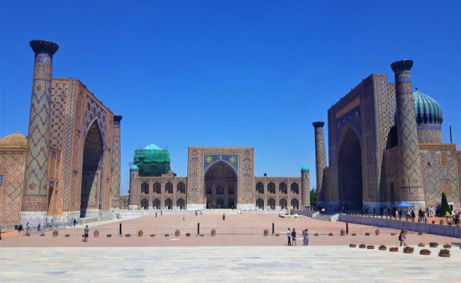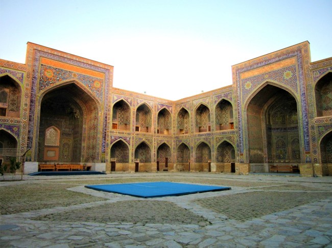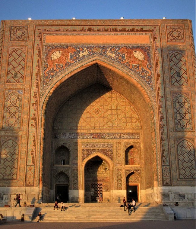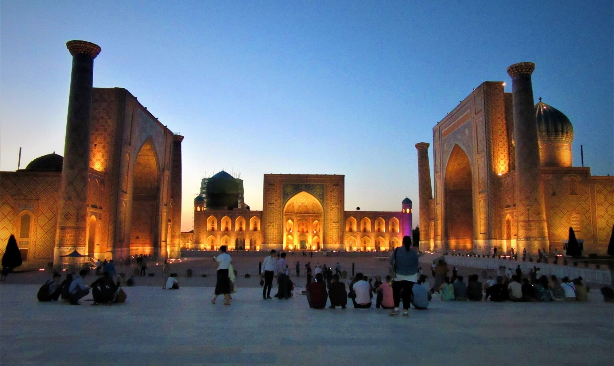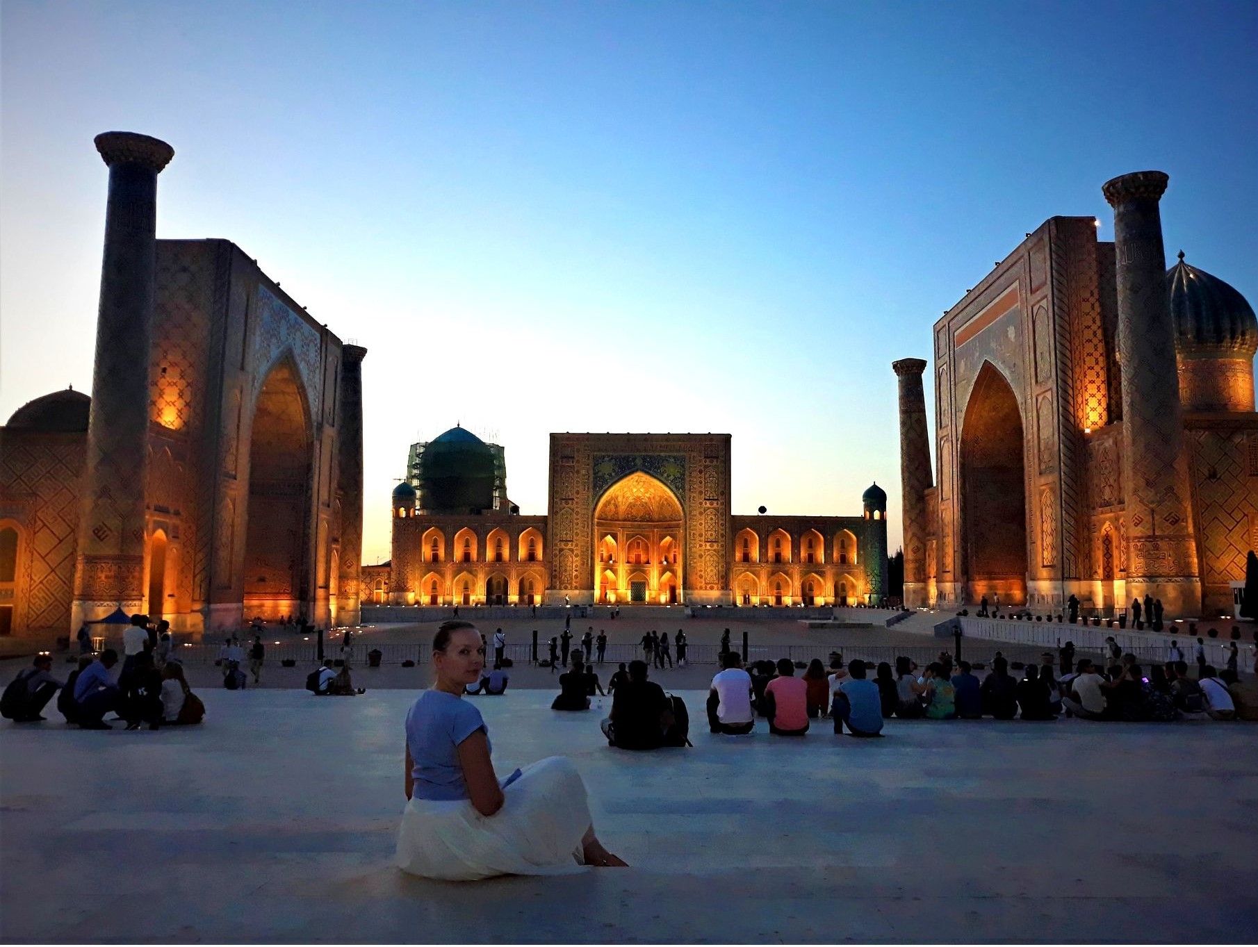Z tym kompleksem kojarzy się właśnie Samarkanda, to swoista wizytówka tego miasta, ikoniczne miejsce całego Uzbekistanu. Ba! Śmiem stwierdzić, że to najwspanialszy zespół architektoniczny w całej Azji Środkowej. Trzy strzeliste madrasy robią piorunujące wrażenie. Wyłożone od fundamentów po same szczyty połyskującymi płytkami ceramicznymi w odcieniach błękitu, wznoszą się wokół otwartej przestrzeni tworząc zespół o niesamowitej symetrii. Registan (dosłownie oznacza”piaszczyste miejsce”) pierwotnie był targowiskiem, na którym zbiegało się sześć głównych ulic Samarkandy. Później odbywały się tu parady wojskowe i publiczne egzekucje (z tego względu zasypywany był piaskiem), a bolszewicy urządzali polityczne wiece i procesy. Słowem registan określa także najważniejsze miejsca innych miast, coś takiego jak nasze dzisiejsze rynki. Aktualnie jest on odrestaurowany, a wieczorami odbywają się tu spektakle światła i dźwięku.