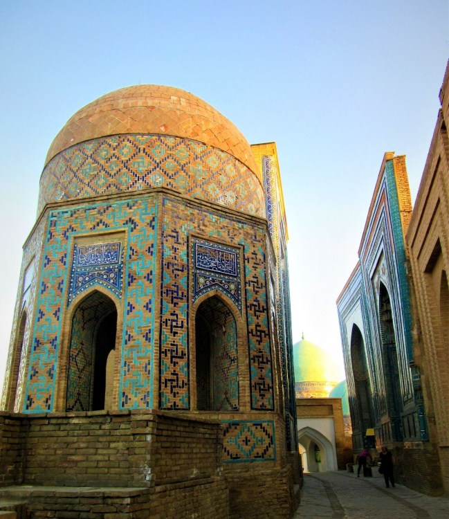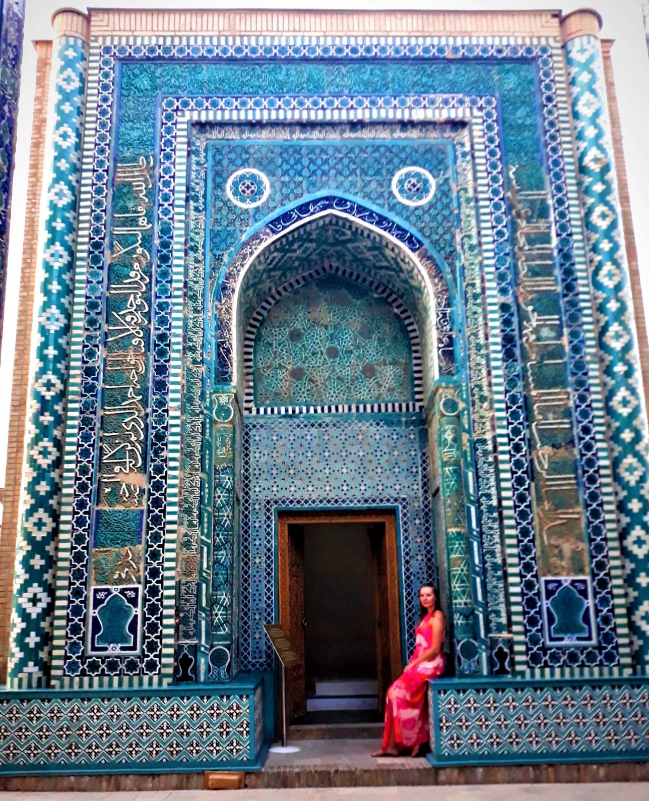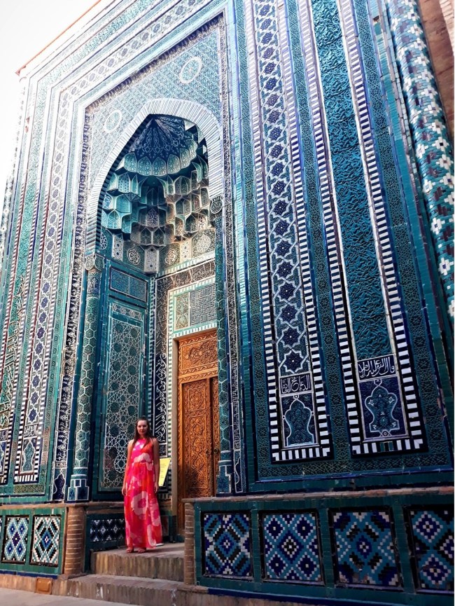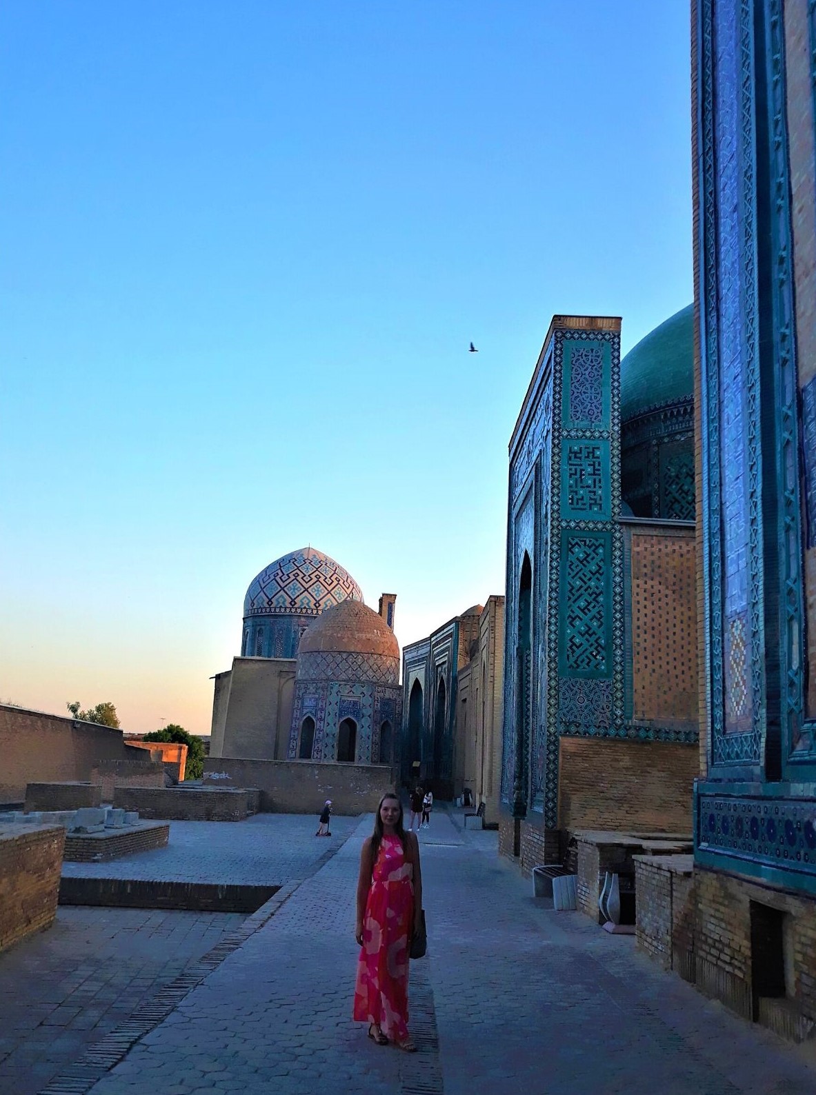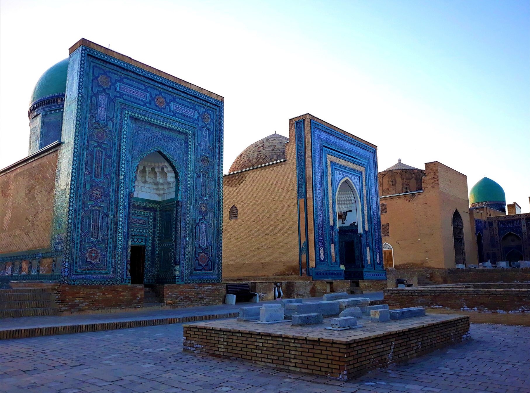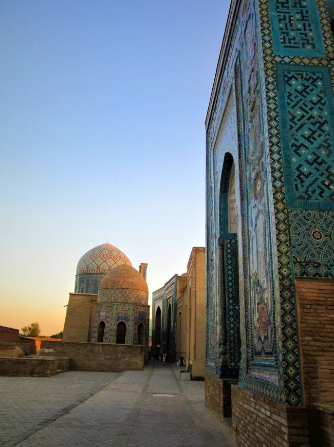 To chyba moje ulubione miejsce na mapie Samarkandy. Poszłam tam dwukrotnie w ciągu jednego dnia (chociaż znajdowało się na saaaaamym krańcu miasta): pierwszy raz pojawiłam się tam z rana, a potem wróciłam po południu, kiedy złote promienie zachodzącego słońca pięknie oświetlały cały kompleks. To swoiste dzieło sztuki, gdzie spoczywa timurydzka arystokracja (urzędnicy imperium i ważne osobistości sułtańskiego dworu). Groby i inne budowle funeralne pokrywają reliefy i płytki ceramiczne w różnych odcieniach błękitu, a całość zdobią motywy roślinne i kaligraficzne.
