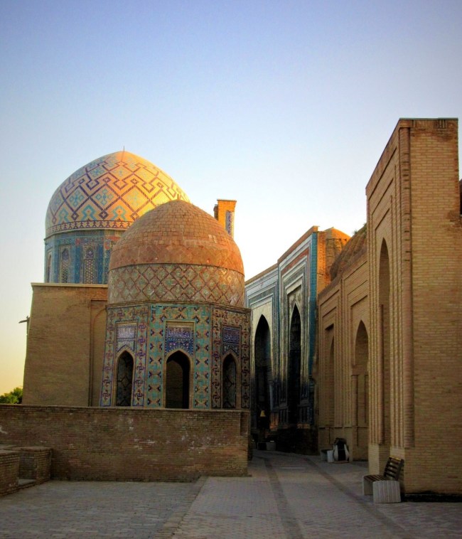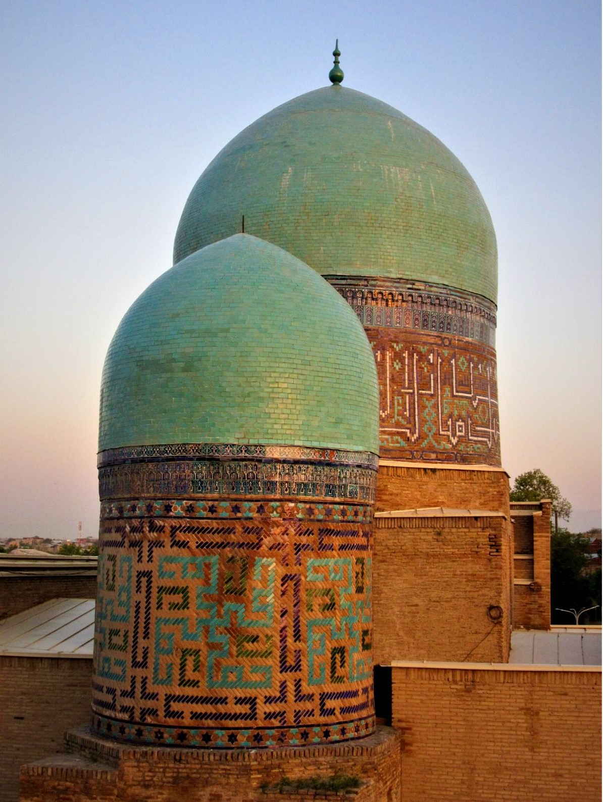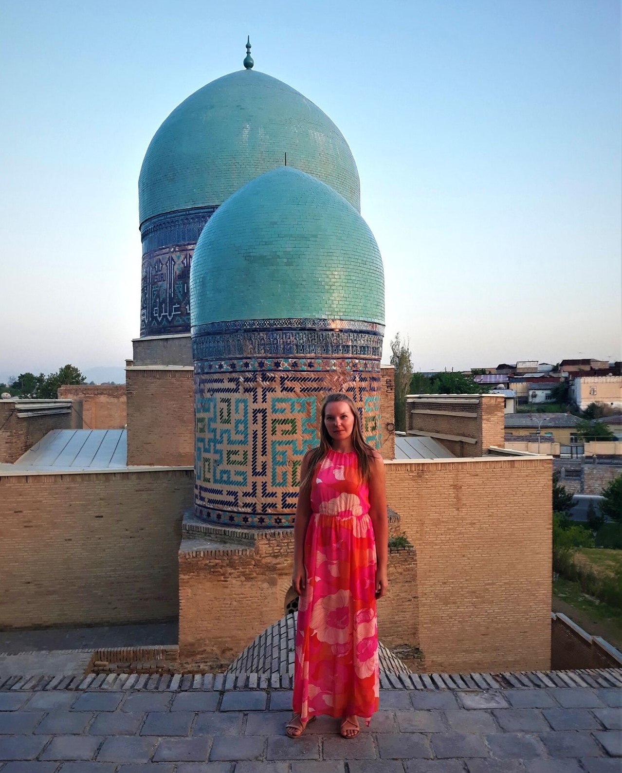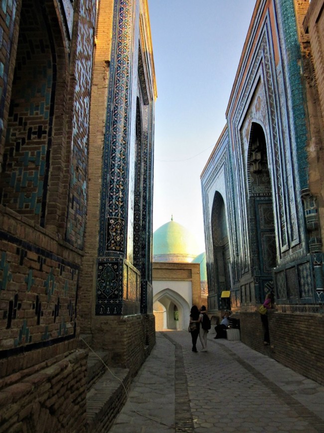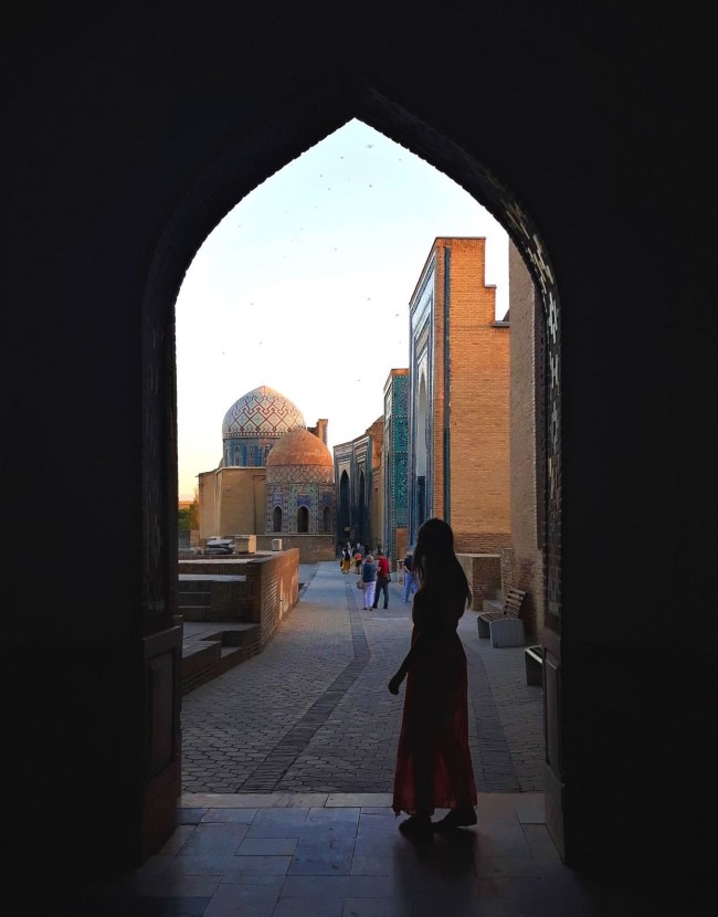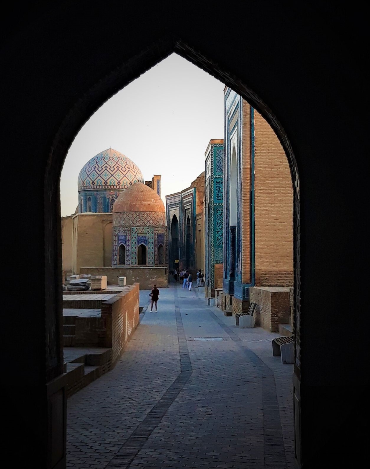 To chyba moje ulubione miejsce na mapie Samarkandy. Poszłam tam dwukrotnie w ciągu jednego dnia (chociaż znajdowało się na saaaaamym krańcu miasta): pierwszy raz pojawiłam się tam z rana, a potem wróciłam po południu, kiedy złote promienie zachodzącego słońca pięknie oświetlały cały kompleks. To swoiste dzieło sztuki, gdzie spoczywa timurydzka arystokracja (urzędnicy imperium i ważne osobistości sułtańskiego dworu). Groby i inne budowle funeralne pokrywają reliefy i płytki ceramiczne w różnych odcieniach błękitu, a całość zdobią motywy roślinne i kaligraficzne.