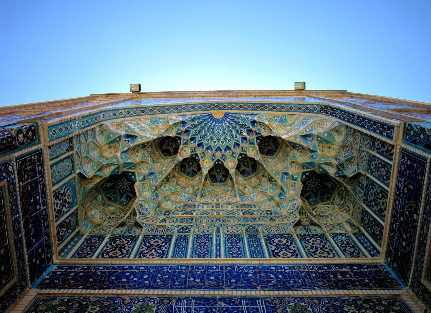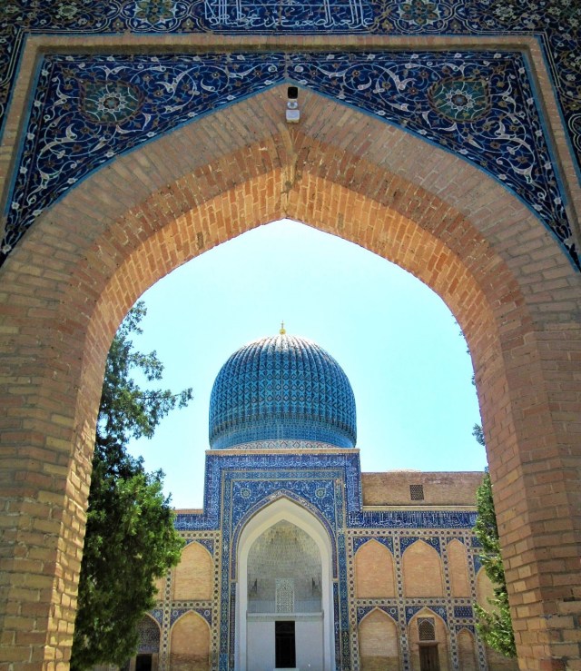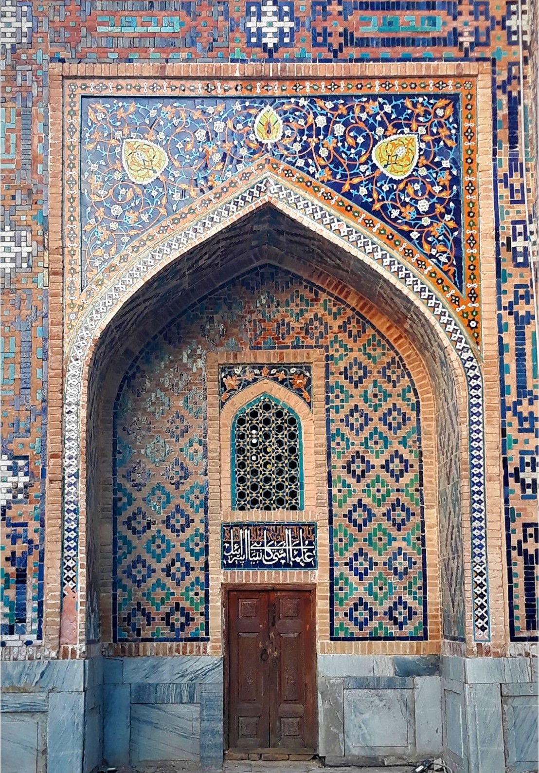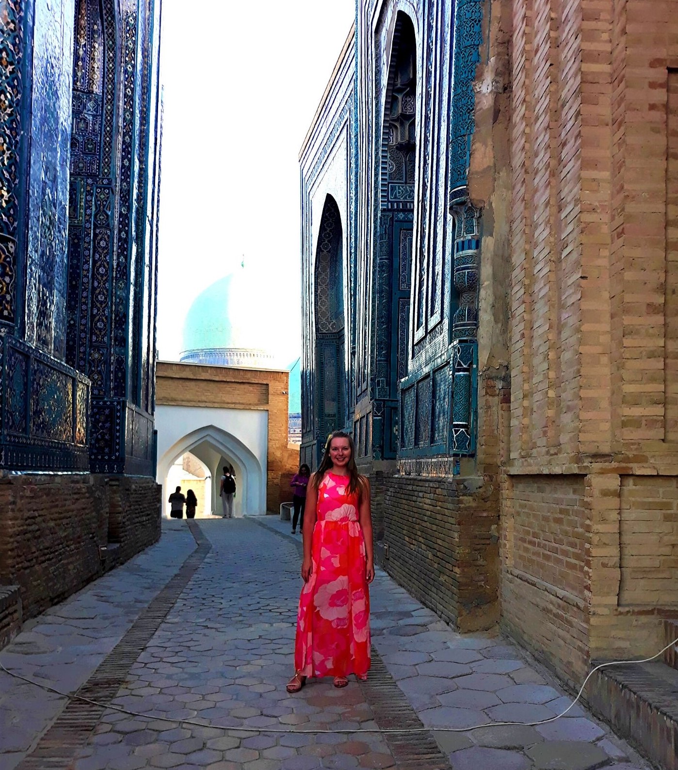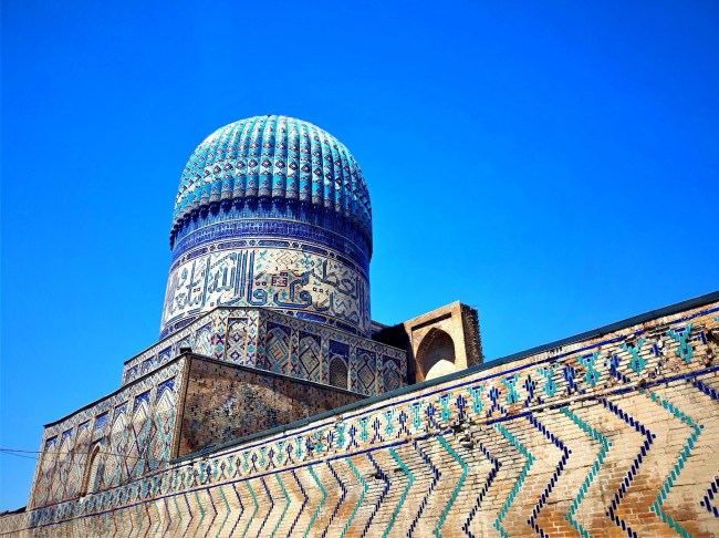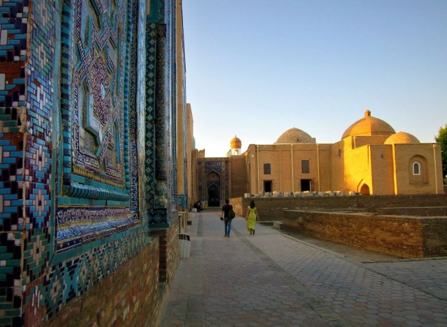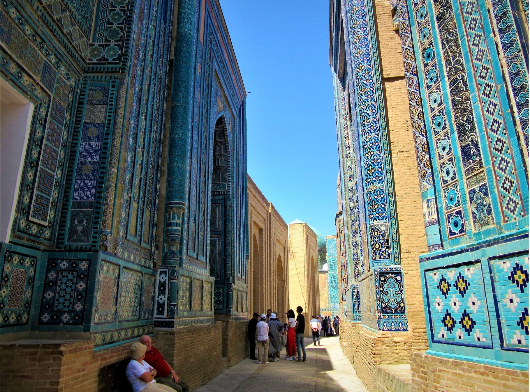 To chyba moje ulubione miejsce na mapie Samarkandy. Poszłam tam dwukrotnie w ciągu jednego dnia (chociaż znajdowało się na saaaaamym krańcu miasta): pierwszy raz pojawiłam się tam z rana, a potem wróciłam po południu, kiedy złote promienie zachodzącego słońca pięknie oświetlały cały kompleks. To swoiste dzieło sztuki, gdzie spoczywa timurydzka arystokracja (urzędnicy imperium i ważne osobistości sułtańskiego dworu). Groby i inne budowle funeralne pokrywają reliefy i płytki ceramiczne w różnych odcieniach błękitu, a całość zdobią motywy roślinne i kaligraficzne.