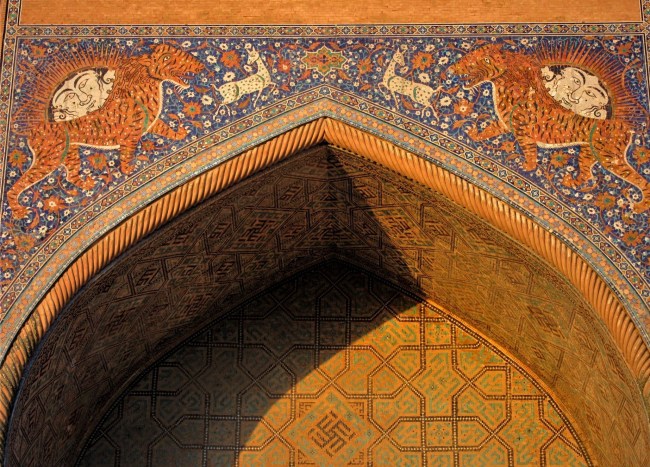 Dopiero po dwóch stuleciach zbudowano po wschodniej stronie, jako lustrzane odbicie tej pierwszej, madresę Szir Dar (1619-1636). Jej nazwa pochodzi od mozaikowych lwów w promieniach słońca (shir), które zdobią naroża wejścia i stanowią tradycyjny symbol Samarkandy. W tym przypadku architekci pogwałcili islamską zasadę nieprzedstawiania żywych istot (ludzi, zwierząt i roślin) w sztuce.