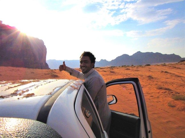 Pustynię można zwiedzać na 3 sposoby: samochodem terenowym (najpopularniejszy i najszybszy), na wielbłądach, albo… pieszo. Tak, widzieliśmy po drodze śmiałków przemierzających bezkres pustyni na własnych nogach. Jednak zawsze muszą być z nami lokalni przewodnicy, czyli Beduini. Od stuleci zamieszkiwali oni tereny pustynne Wadi Rum, a ich dziedzictwo kulturowe jest ważnym elementem tego krajobrazu. Jeszcze niespełna 50 lat temu wiedli oni koczowniczy tryb życia, pędząc przez pustynię stada wielbłądów i kóz. Dzisiaj Beduini żyją przede wszystkim z turystyki, organizując wycieczki z noclegami dla spragnionych wrażeń turystów. Naszym gospodarzem był niejaki Hilal, którego wujek miał 34 dzieci – tyle zdołałam o nim zapamiętać 🙂