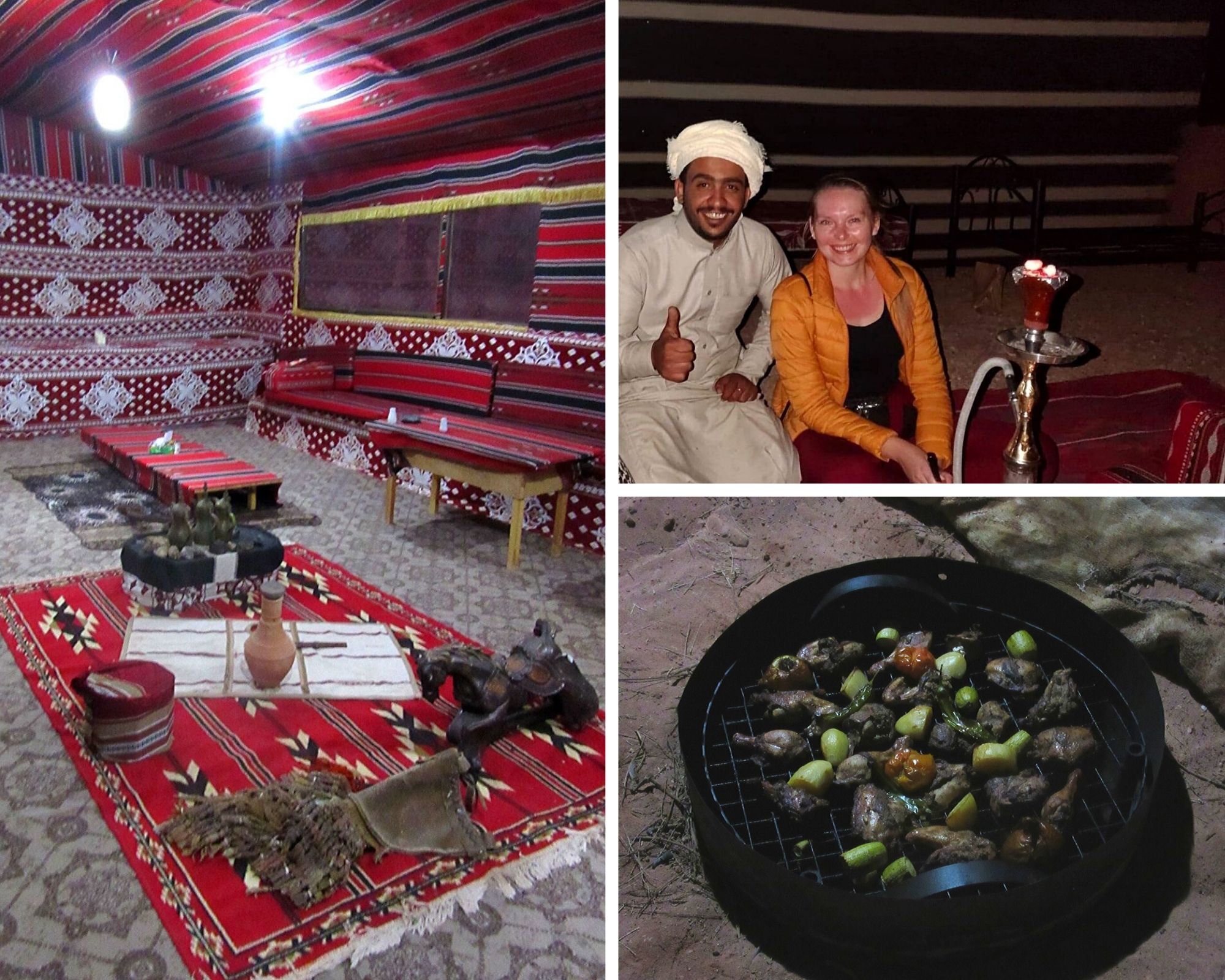No właśnie jak to jest z tym jedzeniem? Kolacja na pustyni jest spektakularnym show, ponieważ… wyciągana jest z ziemi. A dokładniej ze specjalnego metalowego pojemnika, który przez kilka godzin utrzymuje w cieple dwu- lub trzypoziomową konstrukcję z siatki. Na każdym z poziomów umieszcza się mięso i warzywa. Całość przykrywa się srebrną folią i zasypuje piaskiem. Posiłek spożywa się w wielkim namiocie, w którym też można się ogrzać – wieczory na pustyni są chłodne. Na kolację jest  grillowane mięso i warzywa (ziemniak, cukinia, cebula, marchew), potrawka warzywna w sosie pomidorowym, ryż, sałatka warzywna, a do tego hummus, świeży chlebek i deser (lokalne słodkości). Och, jakież to wszystko było przepyszne, lepsze niż z grilla!