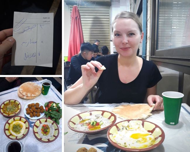 Żeby zjeść prawdziwy jordański posiłek, koniecznie trzeba się wybrać do restauracji Hashem. To legendarne miejsce, znane zarówno wśród turystów, jak i miejscowych, gdzie serwowane są przekąski w stylu bliskowschodnim, między innymi falafele, hummus, mutabal czy baba ghanusz. Podobno nawet sam król Jordanii wraz z rodziną czasami pojawia się w tym miejscu. Restauracja nie robi piorunującego wrażenia, wręcz przeciwnie, a nazywanie tego miejsca restauracją to za dużo powiedziane. Szczerze przyznam, że sama z siebie bym tam nigdy nie weszła i ominęła szerokim łukiem, gdybym nie przeczytała tyle świetnych rekomendacji na jego temat. To nieco ponure i obskurne miejsce, z przezroczystą folią zamiast porządnej ceraty i bez posługiwania się sztućcami. Jednak potrawy tam serwowane rekompensują wszelkie niedogodności i łagodzą negatywne wrażenie – nigdzie nie jadłam lepszych falafeli i hummusu, a na samą myśl cieknie mi ślinka 🙂