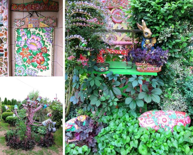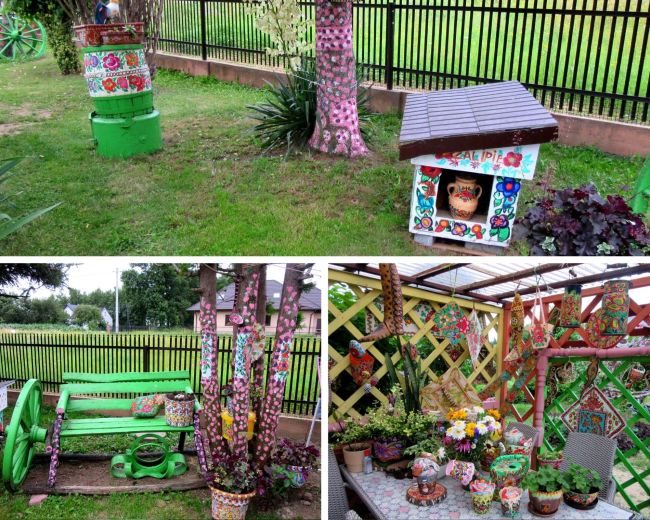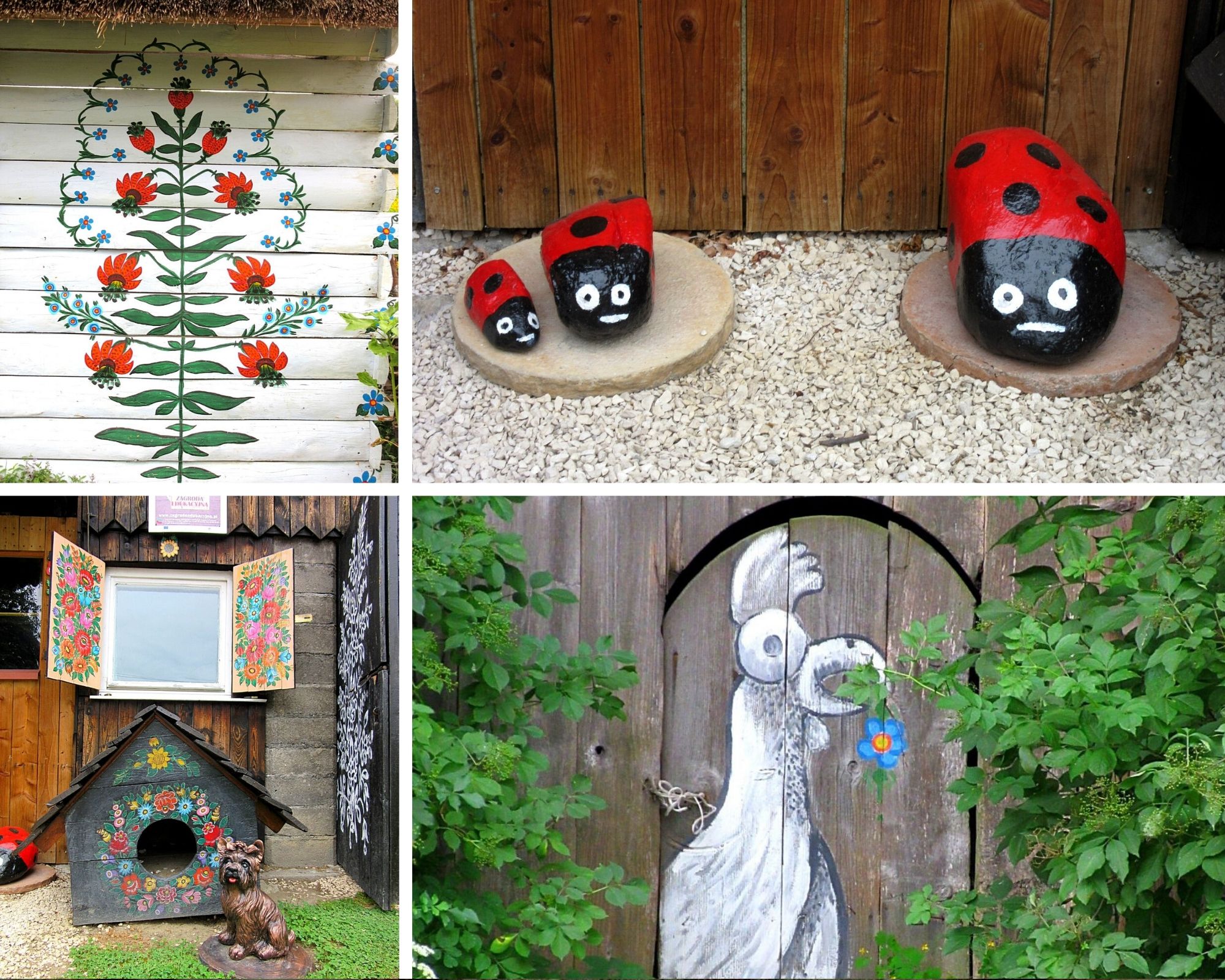 Idąc dalej, przyglądając się przypadkowemu gospodarstwu z ogromnym domem, staruszka siedząca na ławce na podwórku powiedziała, że mogę wejść na posesję i tam na spokojnie zrobić zdjęcia. Nie wahając się ani sekundy, weszłam i znalazłam się w artystycznym raju. Okazało się, że nie tylko dom był ozdobiony, ale także doniczki, buda dla psa, kamień oraz… drzewo! Co więcej, staruszka zaprosiła mnie do środka, do prawdziwego, autentycznego domu, do swojej kuchni i sypialni.  Starsza pani ma niesamowitą cierpliwość i niebywały talent, bo maluje wszystko, co się da 🙂 Ja po prostu oszalałam do końca 🙂