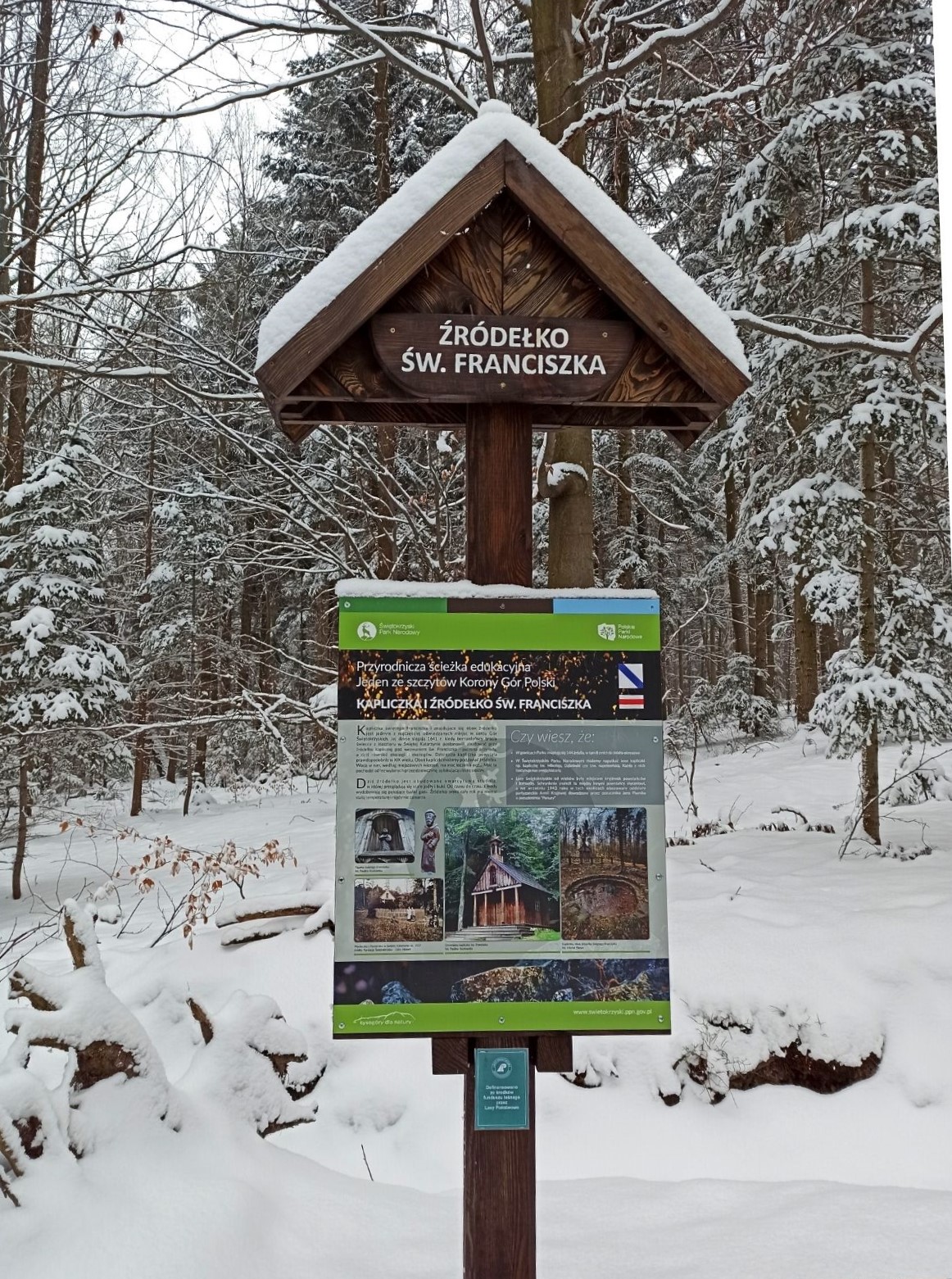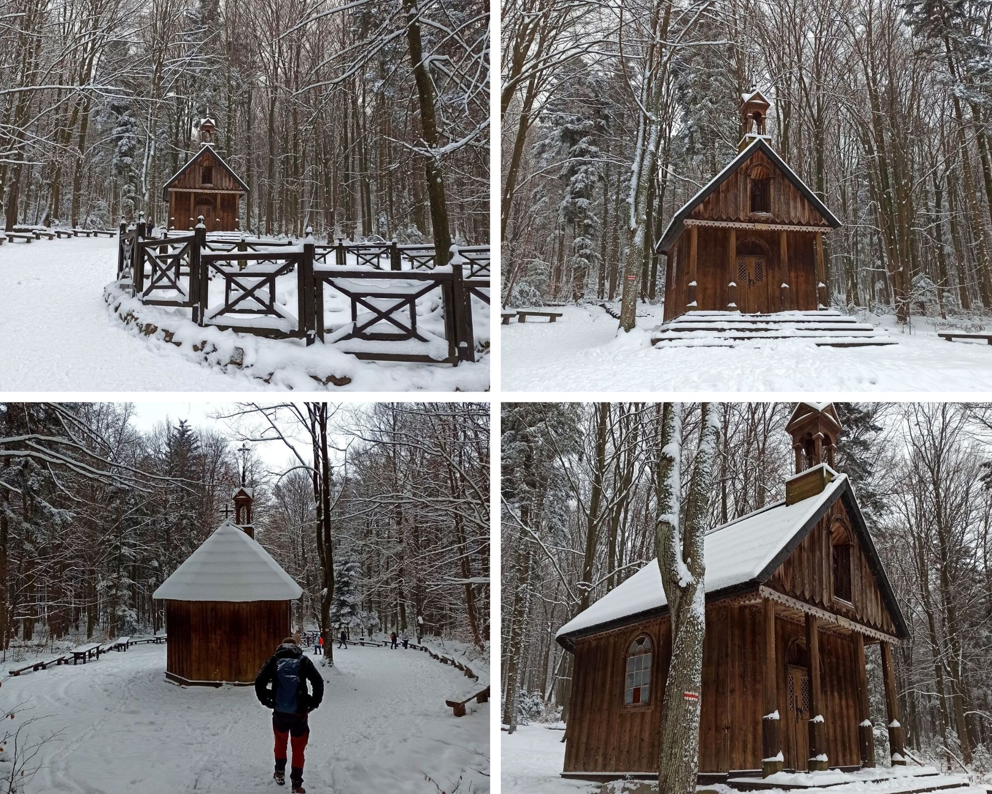 Trasa sama w sobie nie wymaga zbytniego wysiłku (nawet dla tak leniwej buły jak ja), ale jest kilka wymagających podejść – jak to w górach bywa. Wycieczka zaczyna się przy klasztorze bernardynek z II połowy XV wieku, zwany Św. Katarzyną. Kawałek dalej, już w lesie znajduje się niewielka kapliczka cmentarna z pocz. XIX wieku, nazywana popularnie kapliczką Żeromskiego. We wnętrzu tynku tej kapliczki Stefan Żeromski w 1881 roku podobno wydrapał swój podpis, który widoczny jest do dnia dzisiejszego. Ja niestety nie dostrzegłam żadnego podpisu, ale też specjalnie się nie przyglądałam. Obok widoczne są również dwie mogiły – jedna z okresu powstania styczniowego, a druga z II wojny światowej. To właśnie tam rozpoczyna się szlak czerwony. Nieco wyżej, na niewielkiej polanie znajduje się obmurowane kamiennym kręgiem źródełko św. Franciszka, które podobno posiada cudowne właściwości, a także bardzo urocza drewniana kapliczka.