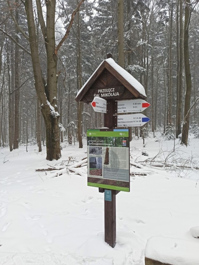 Teraz to już tylko z górki. W trakcie dalsze wędrówki schodzi się na głębiej wciętą Przełęcz Kakonińską, kulminacja której jest Przełęcz św. Mikołaja, gdzie można zrobić sobie krótką przerwę. Znajduje się tam drewniana kaplica s. Mikołaja i ławeczki, które zachęcają do odpoczynku. Dalej leśna droga kieruje się w dół na południowe zbocze, by w końcu wyjść spomiędzy drzew do miejscowości Kankonin, gdzie kończy się (lub zaczyna) wędrówka na szczyt Łysicy.