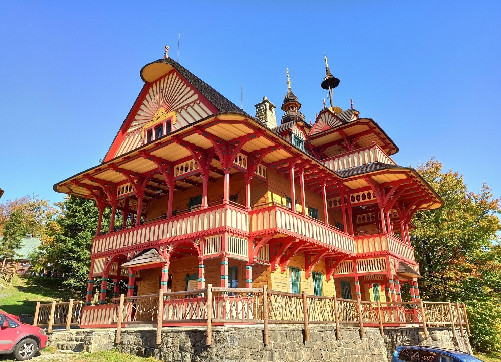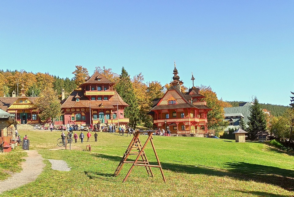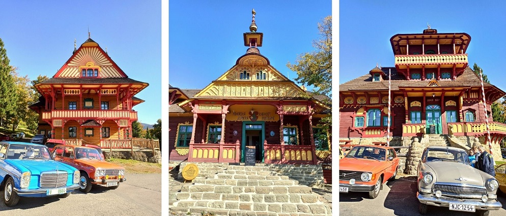 Jus na samym początku, idąc od strony parkingu można dostrzec kolorowe, przepiękne budynki, które zachwycają ilością kolorów i detali. Największe wrażenie robią dwa z nich: Maměnka oraz Libuśin. Obecnie we wnętrzach znajdują się hotel oraz restauracja. Domki powstały w roku 1899, a ich autorem był Dušan Jurkovič. Wszystkie budowle tego słowackiego architekta charakteryzuje oryginalny styl, na który wpływ miała architektura ludowa. I to doskonale widać na budynkach w Przełęczy Pustevny.