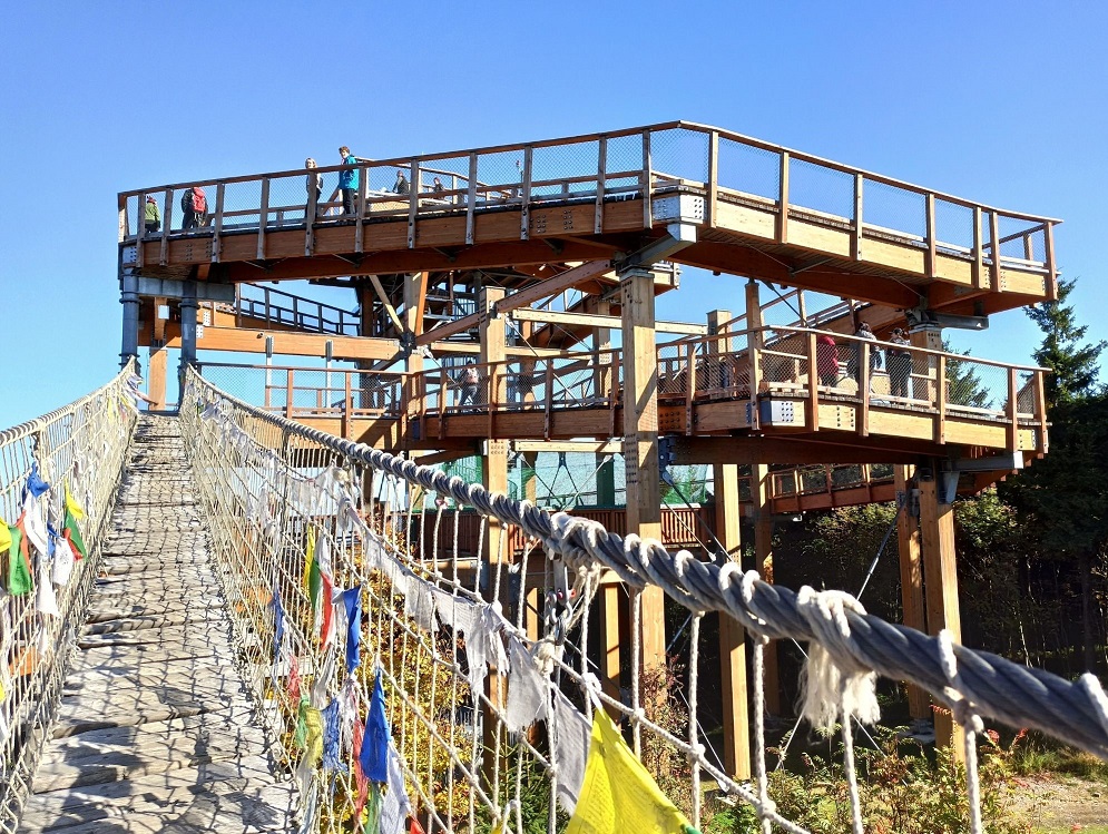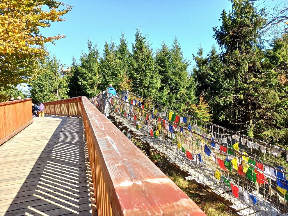Bez wątpienia to największa i najbardziej zaskakująca atrakcja tego miejsca. To oryginalny most wiszący niczym w Himalajach. Jak to z wiszącymi mostami bywa, w trakcie spaceru mocno buja, dlatego trzeba się trzymać balustrad. Przy dobrych warunkach atmosferycznych przejście tą ścieżką sprawia wrażenie, jakbyśmy wędrowali przez dżunglę. Przez cały czas się zastanawiałam, czy rzeczywiście jestem w Czechach, czy może jakimś cudem przeniosłam się do Tybetu, Nepalu, a może Kostaryki?