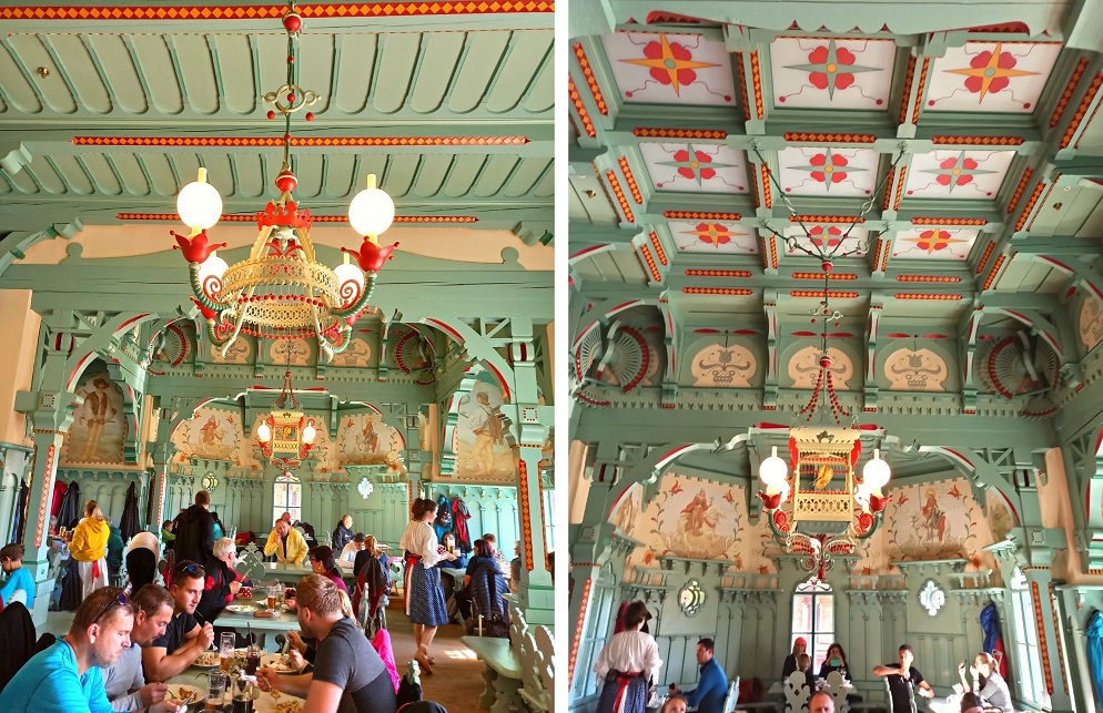 Tego dnia, gdy pojawiłam się na Przełęczy Pustevny, restauracja pękała w szwach. Trudno się dziwić, bo każdy chciał zasmakować w lokalnych pysznościach w otoczeniu bajkowego wnętrza. Problemem jest brak menu w języku angielskim – wszystkie dania widnieją po czesku, co jest dość uciążliwe. Chcąc zamówić coś lokalnego, straciliśmy dużo czasu na zastanawianie się i tłumaczenie przez translator poszczególnych dań. Obsługa też średnio mówi po angielsku i trudno im cokolwiek polecić 🙂 Trzeba się uzbroić w cierpliwość i dobry tłumacz języka czeskiego 🙂