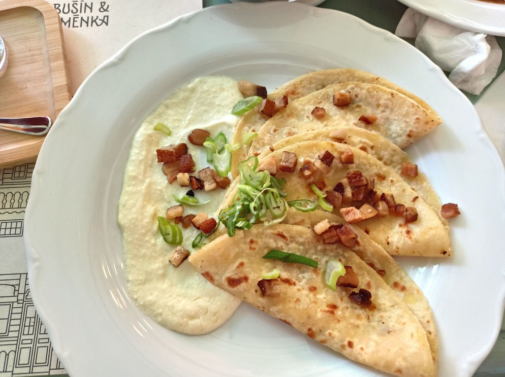 Restauracja Libušín serwuje dania kuchni regionalnej. Kuchnia czeska jest bardzo mięsna oraz ziemniaczana, ale tutaj jest także zaskakująca. Wbrew pozorom nie dostaniemy tam smażonego sera czy innych typowych czeskich specjałów. Co zatem warto spróbować? Moim zdecydowanym faworytem są placki ziemniaczane, które wyglądają bardziej jak naleśniki albo tortilla, serwowane z bryndzą, skwarkami i szczypiorkiem (195 koron). Wiem, nie brzmi to za apetycznie, ale gwarantuję, że takie połączenie smakuje obłędnie 🙂 Inną propozycją jest popularna w Czechach rozgrzewająca zupa czosnkowa na bulionie, ze skwarkami i grzankami (69 koron). Mniam!