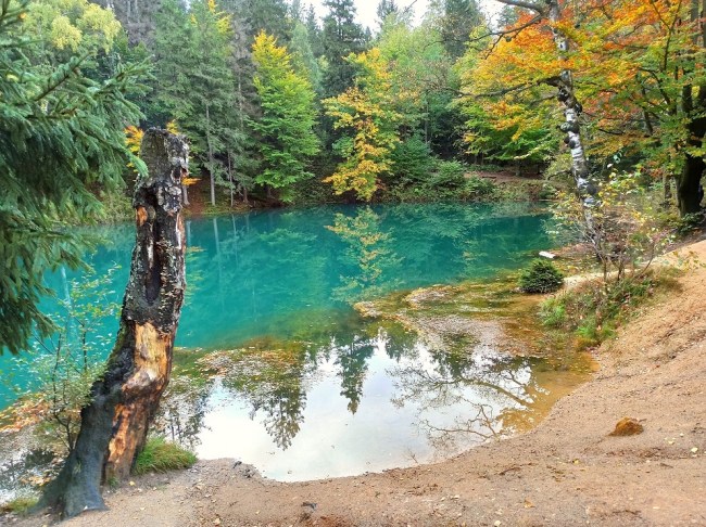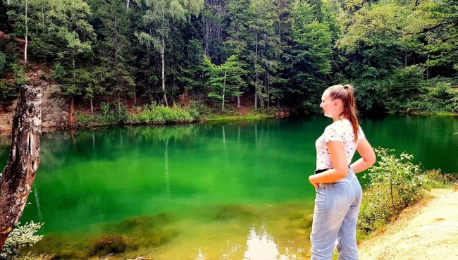 To z cała pewnością najbardziej spektakularne ze wszystkich jeziorek. Nie tylko dlatego, że jest ono największe, ale przede wszystkim zachwyca swoją barwą, nawet w niepogodę. Nazywane jest również Szmaragdowym Jeziorkiem. Jako jedyne spośród wszystkich jest jeziorem czystym, w którym doskonałe warunki sprzyjają rozwojowi flory i fauny. Jego głębokość sięga nawet 20 metrów. By do niego dotrzeć, trzeba trochę przejść i wspiąć się nieco pod górę, pokonując kilka metrów momentami stromego przewyższenia – można się więc nieco zmęczyć. Trzeba też uważać, bo szlak „urozmaicony” jest wystającymi korzeniami drzew, więc bardzo łatwo o skręcenie nogi. Jeziorko powstało na wyrobisku, które nazywało się „Nowe Szczęście”. Swój kolor zawdzięcza związkom miedzi.