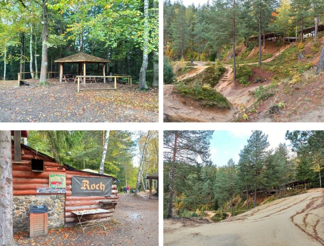 • Na szlaku, przy znajduje się wiata, ławeczki i mała gastronomia –  kilka drewnianych budek, w których można kupić jakieś przekąski, zimne piwo oraz drobne pamiątki.