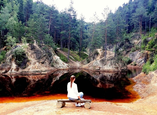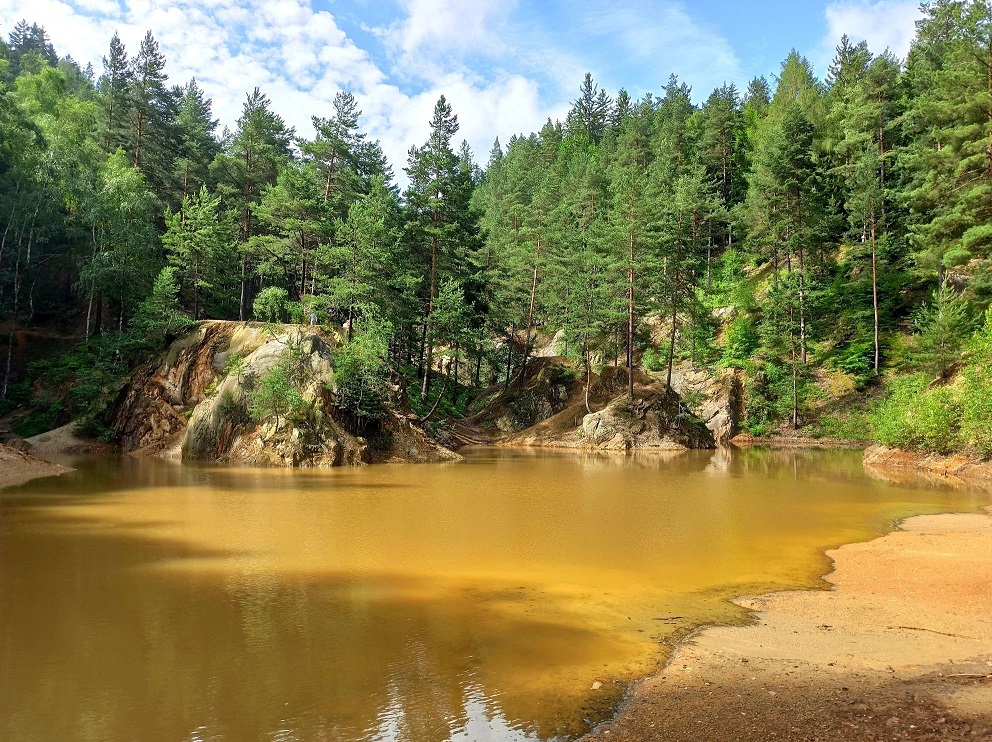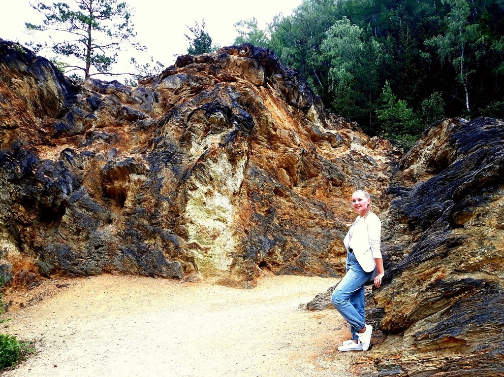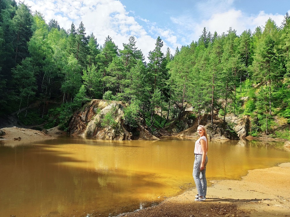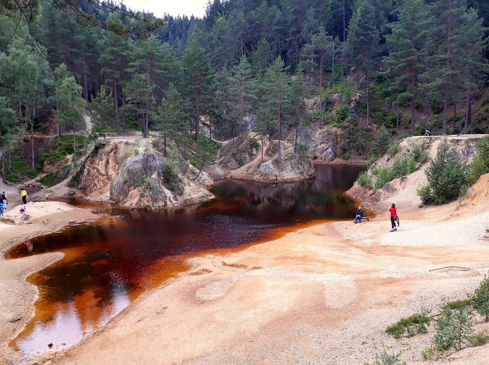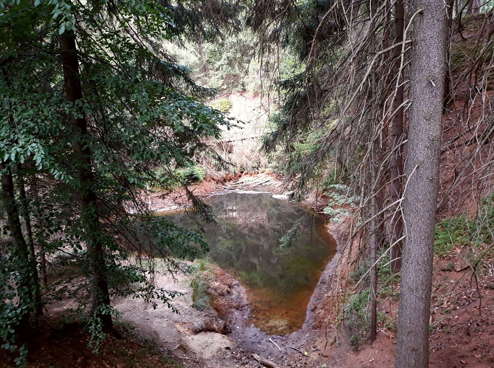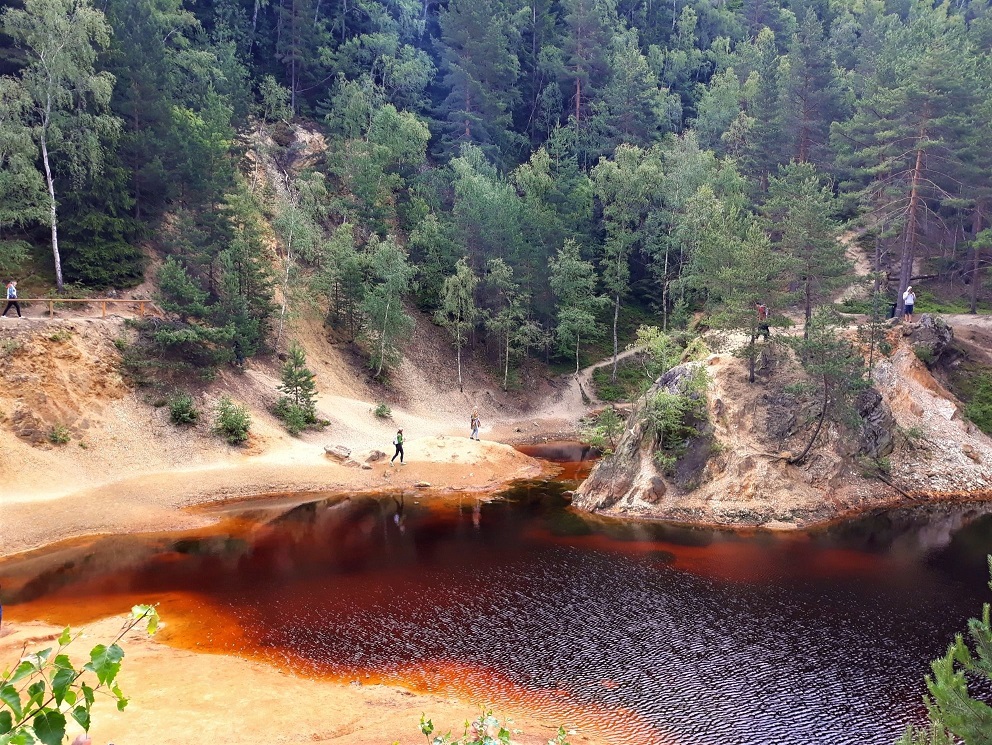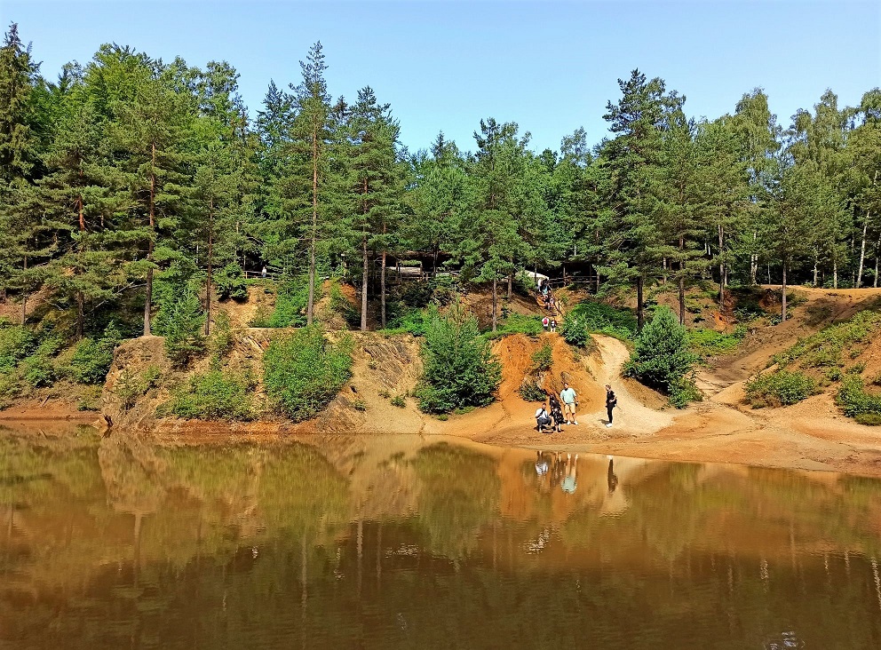 Jest zdecydowanie większe i ładniejsze niż to wcześniejsze, głównie za sprawą skarp i porastających je drzew, a także ciekawym kształcie. To chyba moje ulubione jeziorko, może dlatego, że można do niego blisko podejść i bezpośrednio „obcować” 🙂  Czerwone jeziorko jest szerokie na ok. 400 metrów i długie na 100 metrów. Jest też zejście do dna jeziorka, a także przejście na drugą stronę do punktów widokowych. Woda ma kolor purpurowy, rdzawo czerwony, a miejscami po prostu żółty. Kiedyś w tym miejscu znajdowało się wyrobisko „Nadzieja”. Kolor Purpurowego Jeziorka pochodzi od złoża żelaza i siarki.