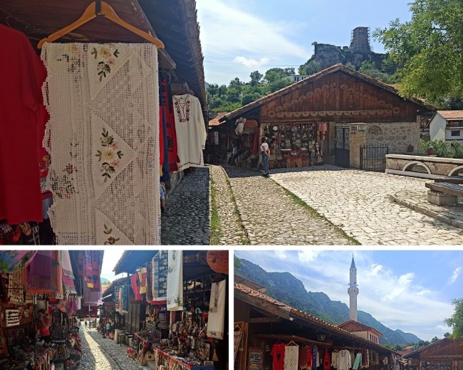 Droga do zamku prowadzi przez bardzo urokliwy, drewniany turecki bazar (Pazari i Derexhikut), pełen kramów z lokalnymi pamiątkami. Bazar niegdyś rozciągał się od centrum miasta do samego zamku i liczył 150 sklepów. Obecnie składa się tylko z około 30 stanowisk, zgrupowanych właściwie przy jednej wąskiej uliczce. Sprzedawcy świdrują wzrokiem każdego turystę i zapraszają do swojego sklepu, bo to właśnie mają najlepszy towar w całym mieście. Przechodzenie tamtędy było nieco denerwujące, bo upierdliwi (ale bardzo mili) ekspedienci niemal wciągali do środa i pokazywali wszystko, desperacko wciskając każdą rzecz. Nierzadko mówili co nieco po polsku (i zapewne w kilkunastu innych językach), by bardziej zachęcić turystę do zakupu ich wspaniałości.