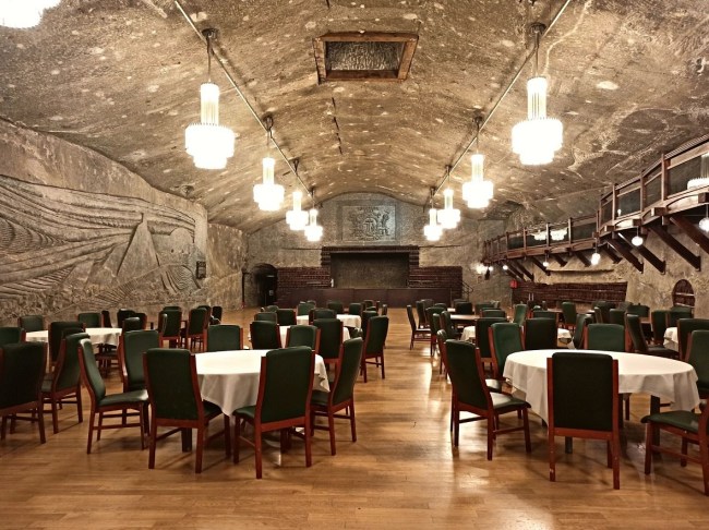 Poza imponującymi i zachwycającymi komorami, w podziemiach Kopalni Soli w Wieliczce, na końcu Trasy Turystycznej znajduje się sklepik z pamiątkami z dodatkiem soli pochodzącej w kopalni, między innymi kosmetyki, magnesy czy przyprawy z zawartością soli. Dalej przechodzi się do podziemnej restauracji, gdzie można posilić się po intensywnym zwiedzaniu. Sądziłam, że w takim miejscu, 130 m pod ziemią, ceny w barze będą astronomiczne, ale zdziwiłam się bardzo – są zdecydowanie niższe, albo podobne do tych w barze mlecznym. Ja zdecydowałam się na rozgrzewającą zupę pomidorową za 9 zł, która w takim miejscu smakowała wyśmienicie 🙂