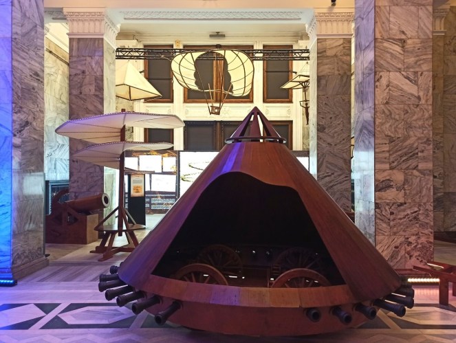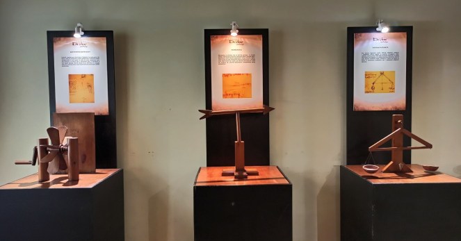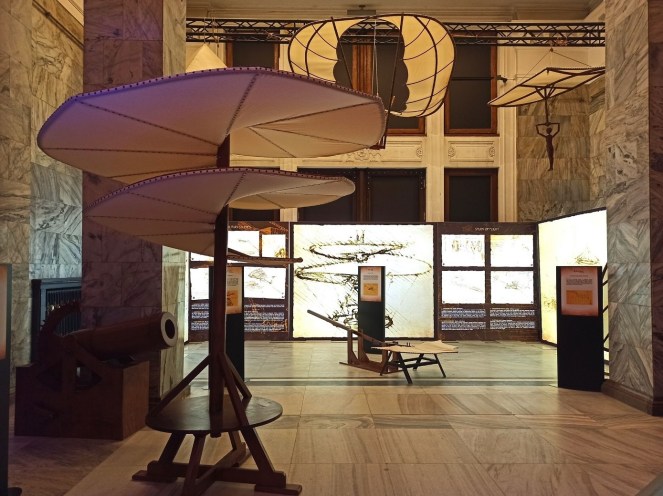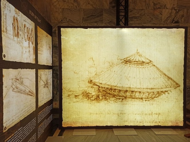 Jednak zanim trafimy do sali poświęconej multimedialnej wystawie, będziemy mieli okazję zapoznać się z „tradycyjnymi” eksponatami autorstwa Leonarda. W tej części ekspozycji zaprezentowana zobaczymy kolekcję ponad 60 eksponatów, wynalazków Da Vinciego, maszyn oraz urządzeń, zbudowanych zgodnie z oryginalnymi projektami i materiałami, które później stały się przedmiotami powszechnego użytku i służą ludzkości po dzień dzisiejszy. Wiedzieliście, że to właśnie on stworzył prototyp dzisiejszego projektora, czołgu pancernego, walcarki czy mechanizmu zegara? To także Leonardo jest architektem idealnego miasta, które po epidemii dżumy w 1484 roku miałoby być czystsze i z dużo lepszym zapleczem sanitarnym. Wszystkie makiety z jego wynalazkami i ich opisem możemy podziwiać w trakcie naszej sensorycznej wędrówki po wystawie.