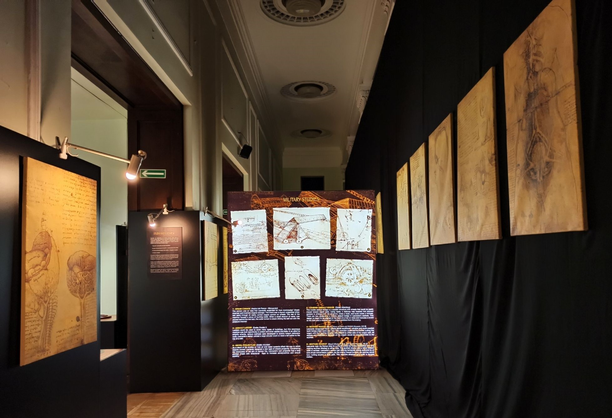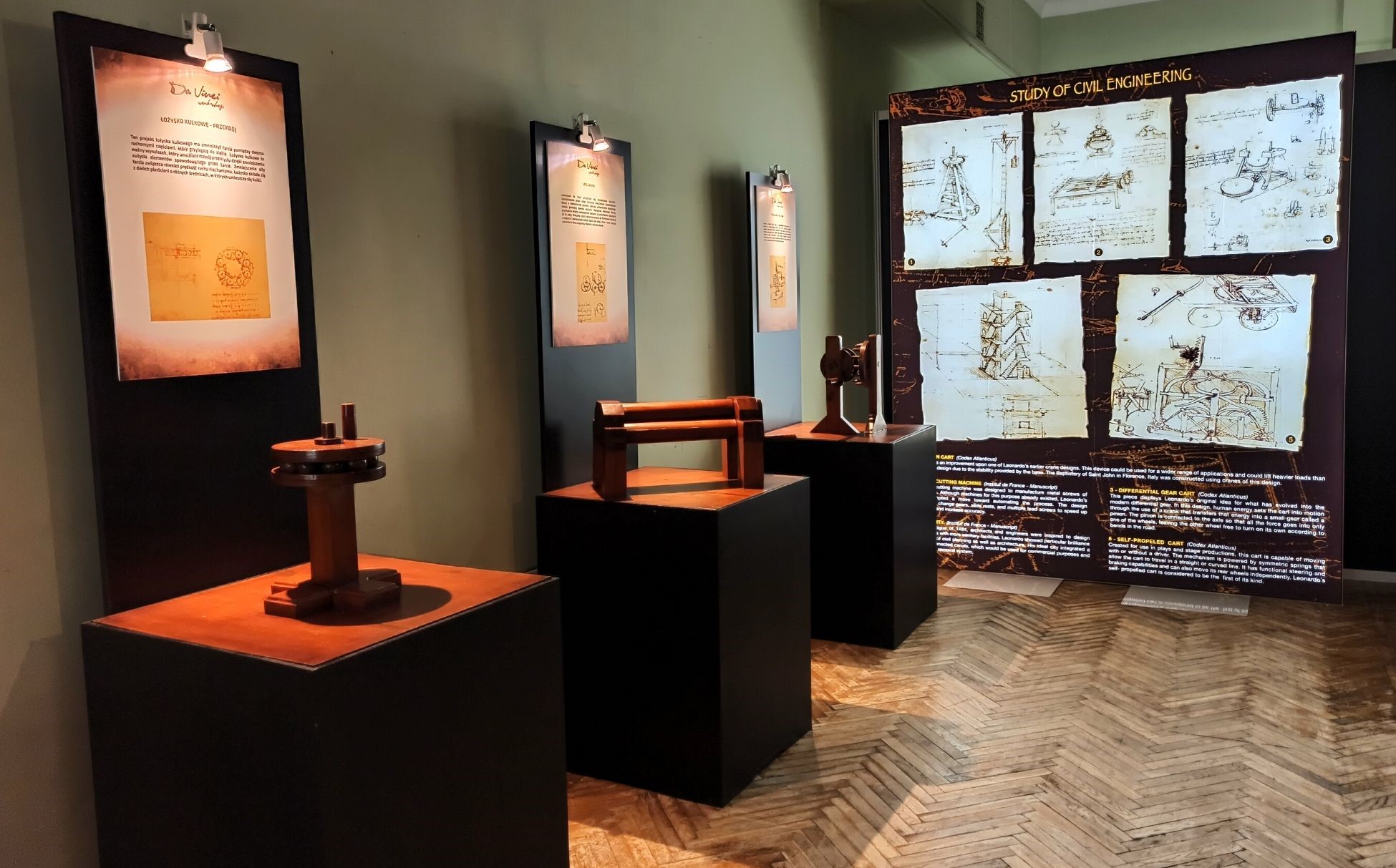 Jednak zanim trafimy do sali poświęconej multimedialnej wystawie, będziemy mieli okazję zapoznać się z „tradycyjnymi” eksponatami autorstwa Leonarda. W tej części ekspozycji zaprezentowana zobaczymy kolekcję ponad 60 eksponatów, wynalazków Da Vinciego, maszyn oraz urządzeń, zbudowanych zgodnie z oryginalnymi projektami i materiałami, które później stały się przedmiotami powszechnego użytku i służą ludzkości po dzień dzisiejszy. Wiedzieliście, że to właśnie on stworzył prototyp dzisiejszego projektora, czołgu pancernego, walcarki czy mechanizmu zegara? To także Leonardo jest architektem idealnego miasta, które po epidemii dżumy w 1484 roku miałoby być czystsze i z dużo lepszym zapleczem sanitarnym. Wszystkie makiety z jego wynalazkami i ich opisem możemy podziwiać w trakcie naszej sensorycznej wędrówki po wystawie.