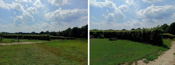 Tuż obok labiryntu bukowego znajduje się drugi – w kukurydzy. Pierwotny labirynt nawiązywał do EURO 2012 i miał powierzchnię 1,3 ha, natomiast ten obecny zajmuje powierzchnię 4,5 ha. Spacerując po labiryncie, można sprawdzić swoją orientację w terenie, jak również i wiedzę. Co ciekawe, podobno na jego terenie nie działają telefony komórkowe, przez co adrenalina jest większa. Każdy uczestnik biorący udział w zabawie ma za zadanie odszukać ukryte pytania i uzupełnić specjalną krzyżówkę. Tak jak w przypadku labiryntu bukowego, prawidłowo wypełnione kupony biorą udział w losowaniu nagród. Niestety w trakcie mojej wizyty labirynt był niedostępny w związku z panującą suszą pole kukurydzy było liche i nie dało się tam zorganizować atrakcji.