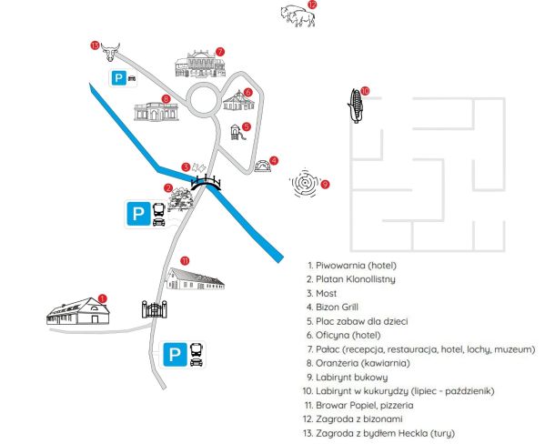 - Po pałacu i parku oprowadza przewodnik, również safari bizon odbywa się tylko z przewodnikiem. Usługa przewodnicka wliczona jest w cenę biletów.