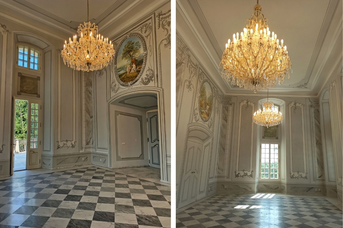 Jak wspomniałam wcześniej, aktualnie pałac poddawany jest renowacji i nie wszystkie komnaty są dostępne. Póki co do zwiedzania udostępniono I piętro, już w nowej odsłonie – salę balową, salon portretów, salon zielony i czerwony, taras widokowy i kaplicę. Reprezentacyjna sala balowa znajdująca się na piętrze ozdobiona została polichromią ornamentalną, akcentującą podziały architektoniczne z pięknie malowanymi scenami pejzażowymi. Modernizacji w stylu rokokowym uległy także apartamenty na piętrze skrzydła zachodniego i północnego, w tym jadalnia, salon czerwony i zielony oraz biblioteka z przyległym do niej pokojem.