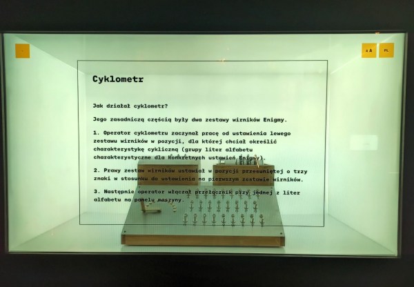 Ekspozycja składa się z trzech zasadniczych części. W pierwszej poznajemy historię szyfrów na przestrzeni dziejów. Mamy szanse zapoznać się ze szczegółami najpowszechniej stosowanych szyfrów i spróbują własnych sił w sztuce szyfrowania, np. za pomocą szyfru Cezara lub bardziej zaawansowanych technik utajniania informacji. Przejdziemy szybki kurs szyfrów, podobny do tego, jaki był udziałem polskich kryptologów w 1929 roku w ramach tajnego kursu zorganizowanego przez Uniwersytet Poznański. Nie powiem, że było to łatwe zadanie, wręcz przeciwnie. Trzeba było się nagłówkować i napocić, żeby rozwikłać zagadki przygotowane przez specjalistów CSE 🙂