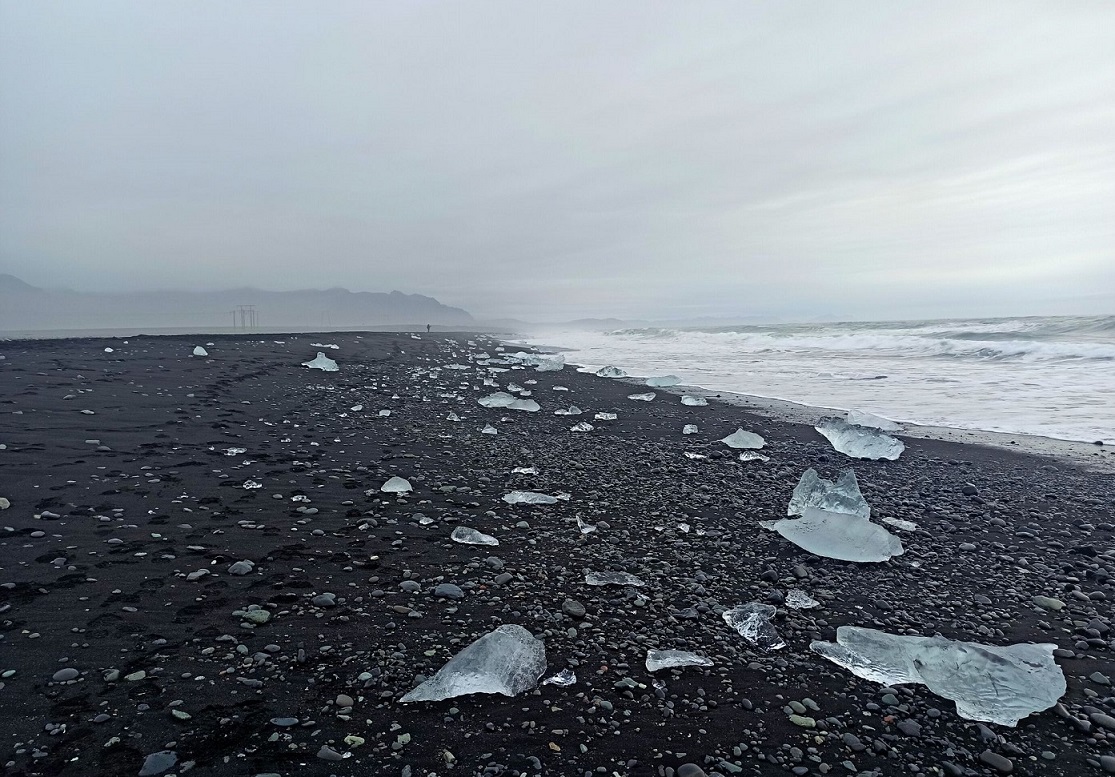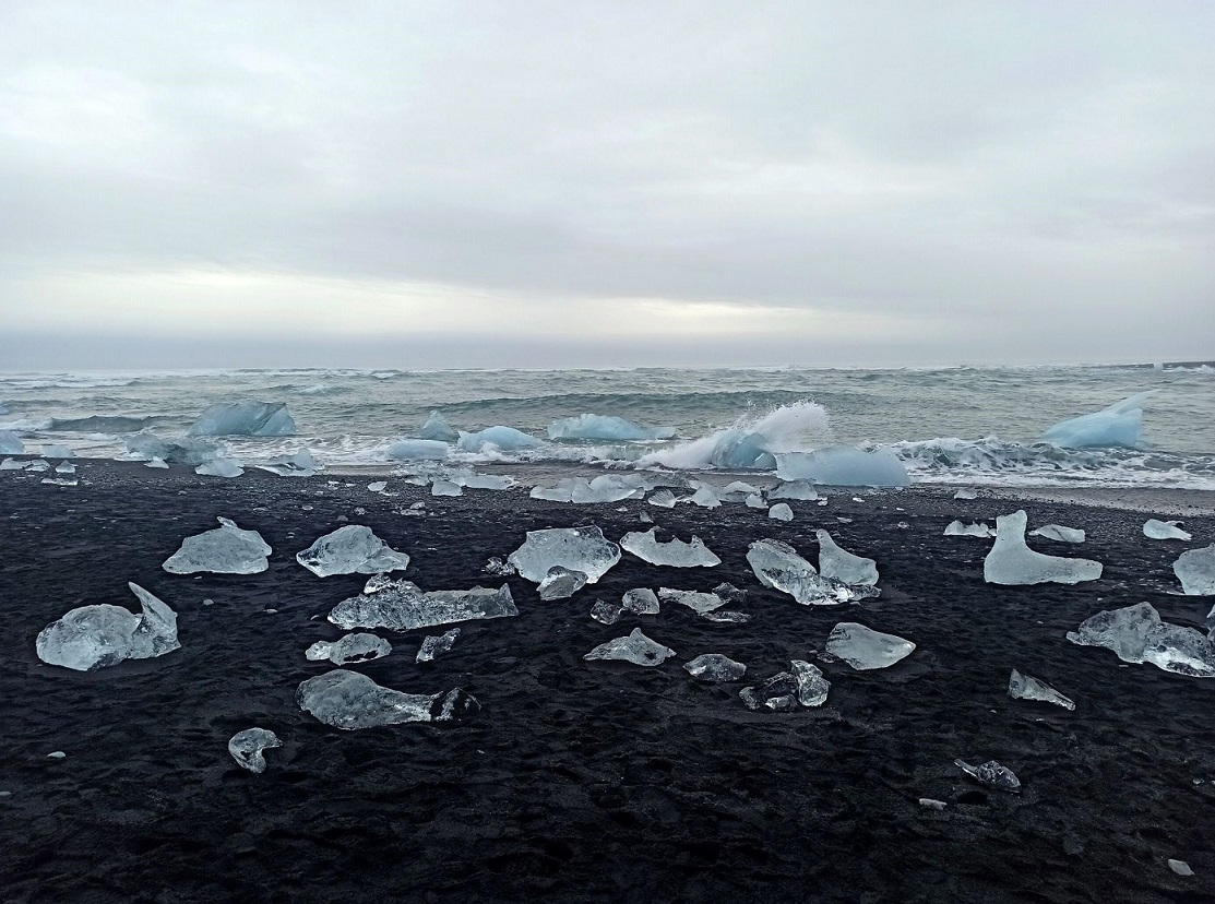 Z kolei góry lodowe wypływające z zatoki na otwarty ocean, niekiedy zostają zepchnięte przez prąd oceaniczny na pobliską plażę. Niewielkie resztki oderwanych od lodowca gór lodowych topniejące na czarnym wulkanicznym piasku tworzą bardzo ciekawe, choć nietrwałe, kształty i widoki. To właśnie one – białe, lodowe „kamienie szlachetne” błyszczące w słońcu na tle czarnego piasku dały nazwę temu niezwykłemu miejscu – Diamentowa Plaża.