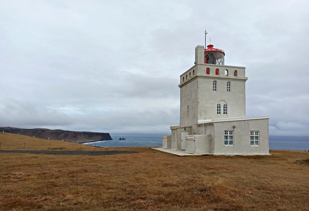 Kiedy dotarłam do tego punktu, również szczęka mi opadła z wrażenia. Co prawda wiatr prawie głowę urwał, ale to nic – panorama rozpościerająca się z góry zrekompensowała wszelkie niedogodności 🙂 Dyrhólaey to niewielki półwysep stanowiący najdalej na południe wysuniętą część Islandii. Ze szczytu promenady Dyrhólaey możemy podziwiać oszałamiające widoki na miejscowe czarne plaże, otoczone z jednej strony błyszczącymi falami Atlantyku, a z drugiej odległymi ośnieżonymi górskimi pejzażami. Sam półwysep jest malutki, jednak o jego atrakcyjności stanowi masywny łuk skalny, widok na pobliską plażę, a także unikalne formacje skalne wyłaniające się z oceanu. Na środku znajduje się Dyrhólaeyjarviti – piękna stara latarnia morska z kwadratową, betonową wieżą z 1927 roku.