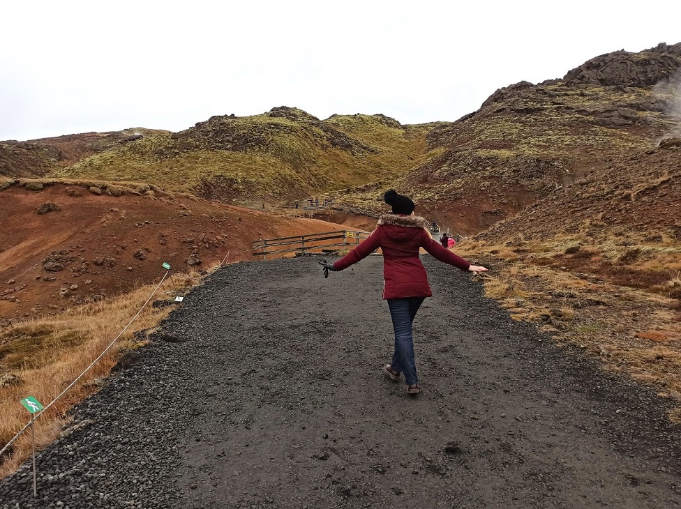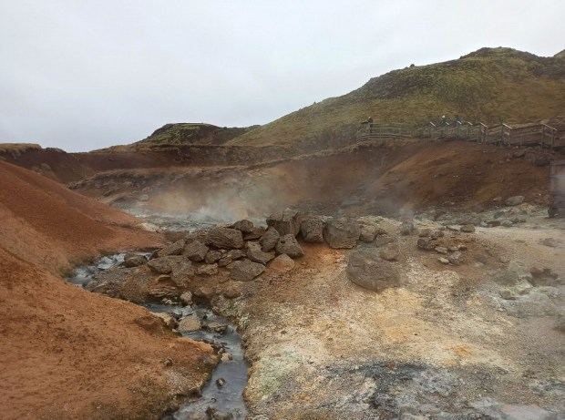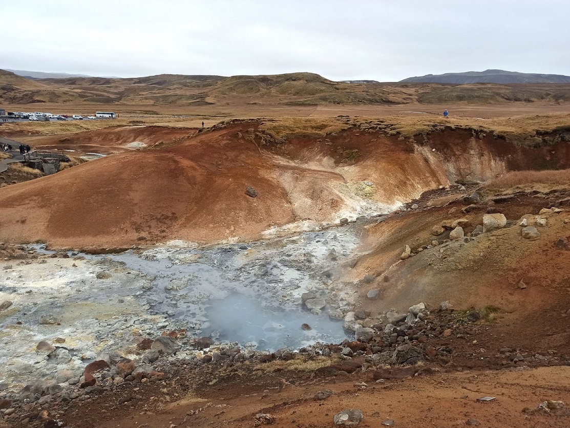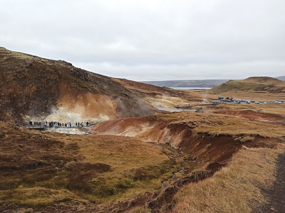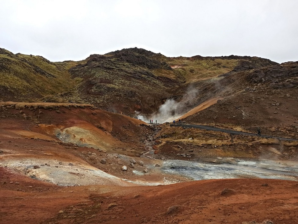 Szalenie ciekawa przestrzeń geotermalna, pełna parujących kominów wulkanicznych i wrzących gorących źródeł, otoczona szeregiem wielokolorowych wzgórz. Pierwsze co zdołamy zauważyć, to intensywną – bardzo intensywną – woń siarki. Brzegi wokół gorących źródeł mają kolor zielony, żółty i czerwony, dając razem ciekawy efekt wizualny. Ze źródeł wydobywają się różne gazy m.in. dwutlenek siarki, chlorowodór i para wodna. Są one bardzo gorące, bo ich temperatura może sięgać nawet 1000°C. Ciekawy był to spacer, bo można zaobserwować, że po drodze coś tam dymiło, coś bulgotało, coś kotłowało. Szlak, przez który poprowadzono drewniane kładki, schodki i platformy dobrze komponują się z urodą tutejszego miejsca. Przejście drewnianą kładką nie zajmie więcej niż 20 minut.