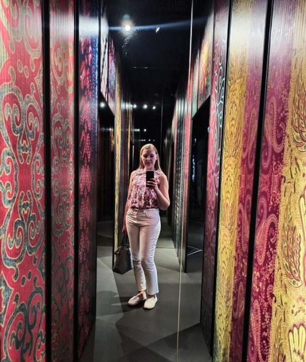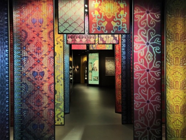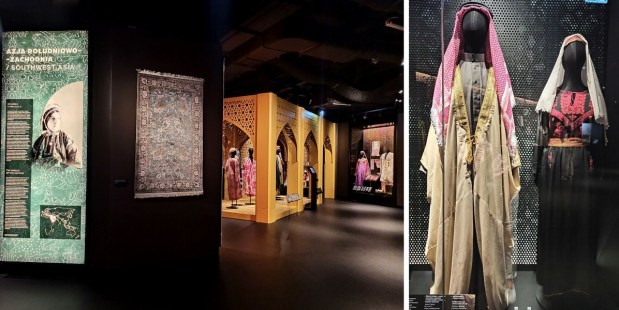 Drugim etapem zwiedzania jest przejście do Azji Centralnej. Z racji tego, że ten kawałek świata jest bliski mem sercu, nie będę ukrywać, że czekałam na tę część wystawy najbardziej. Galeria poświęcona kulturze Azji Centralnej, którą ukształtowały rdzenne społeczności koczownicze oraz wpływy perskie, hellenistyczne, chińskie, arabskie i rosyjskie. To prawdziwy miks kulturowo-religijny, ponieważ przenikały się tu także różne religie: lokalny szamanizm, buddyzm, zaratusztrianizm i islam sunnicki. Obiekty w tej części wystawy zachwycają bogatą kolorystyką i ornamentami. Zobaczyć tu możemy między innymi rękodzieło koczowników z Turkmenistanu, przykłady tkactwa, haftów i kobierców turkmeńskich, filce z Kazachstanu, Kirgistanu i Turkmenistanu wyróżniające się graficznymi korowymi wzorami, różnorodne przykłady ubiorów Kazachów, Kirgizów, Turkmenów i Afgańczyków (np. bogato zdobiona suknia dżumlo) oraz wyróżniające się bogactwem i bogatymi haftami stroje Uzbeków wraz z kolekcją tradycyjnych niskich czapeczek. To także pokaźny zbiór polichromowanych i glazurowanych naczyń ceramicznych (bardzo podobne mam w domu, które przywiozłam z Uzbekistanu:))