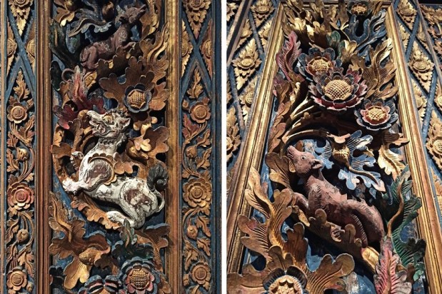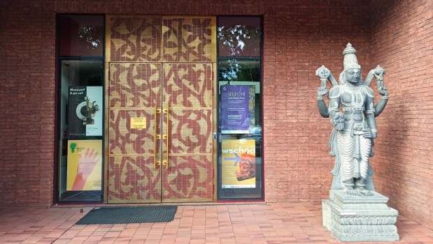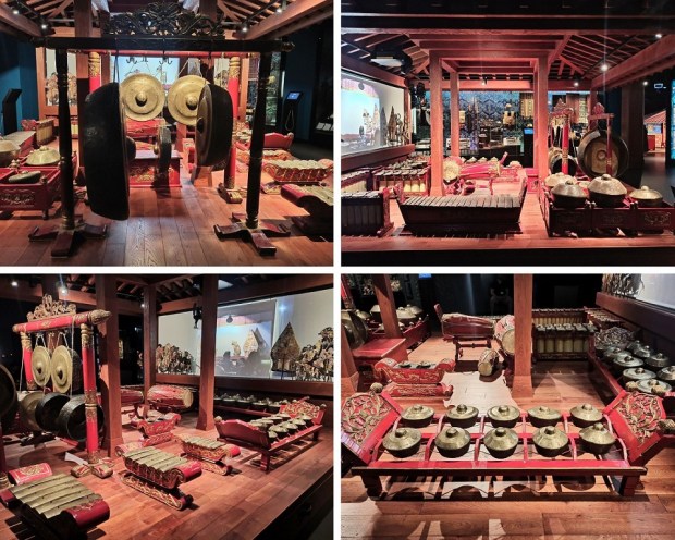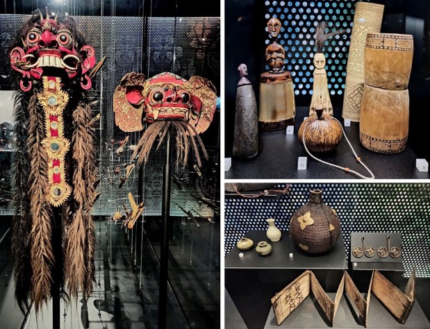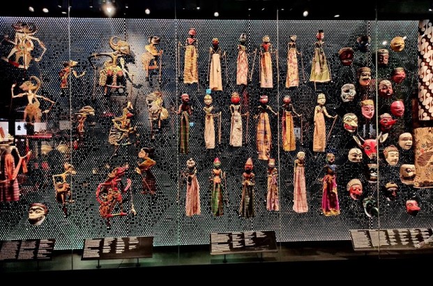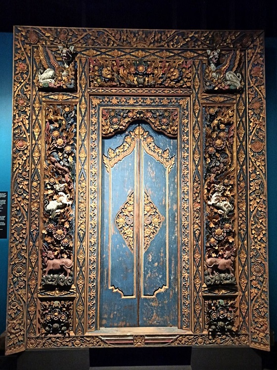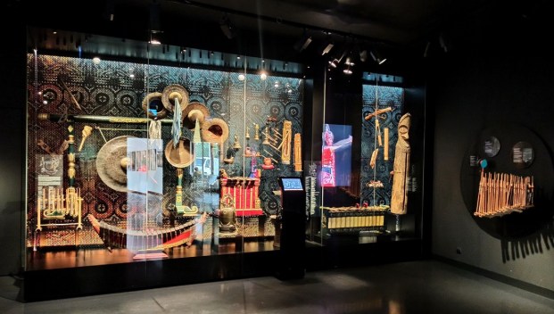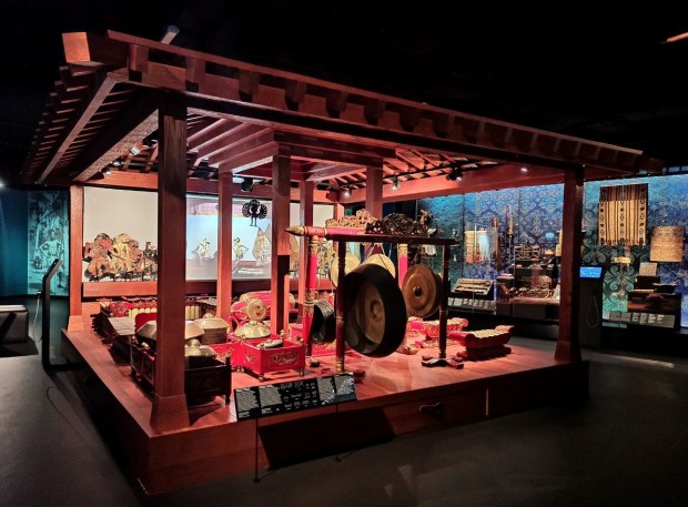 Ta część wystawy skupia się na Indonezji – największego kraju Azji Południowo-Wschodniej, obejmującego ok 18 000 wysp! To bez wątpienia najbogatsza i – moim zdaniem – najpiękniejsza kolekcja w całym muzeum. Zaprezentowane zostały tutaj liczne przykłady tradycyjnej broni, stroje indonezyjskie związane z klasycznymi tańcami balijskimi czy ceremonią ślubu czy zespół instrumentów orkiestry gamelanowej. Można podziwiać tu również liczne lalki wayang wykonywane z ażurowo wycinanej skóry, które wykorzystywane są w przedstawieniach teatru cieni, przepięknie zdobione maski oraz bogatą kolekcję tkanin batikowych. Jednak to, co całkowicie mnie oczarowało to tradycyjnie zdobione balijskie drzwi. Tak mnie urzekły, że długo nie mogłam oderwać od nich wzroku. Innym ciekawym eksponatem jest pendopo, czyli drewniany pawilon służący do koncertów klasycznej indonezyjskiej orkiestry oraz przedstawień teatru cieni. To właśnie tutaj stwierdziłam, że jednak chcę polecieć do dalekiej Azji i cieszyć oczy takimi pięknymi przedmiotami 🙂