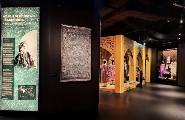 Podróż zaczynamy w Azji Południowo-Zachodniej, czyli Bliskiego Wschodu, gdzie prezentowane są obiekty odnoszące się do wielowiekowej tradycji regionu. Możemy tu podziwiać przedmioty starożytne, wśród których znajduje się najstarszy zabytek w zbiorach Muzeum – cegła fundacyjna z Mezopotamii datowana na XXI w. p.n.e. z odciśnięta w niej inskrypcją w piśmie klinowym. Nawet nie spodziewałam się, że taki okaz może znajdować się w Polsce! Do zbioru innych obiektów w tej części wystawy należą przykłady tkanin i malarstwa z epoki Kadżarów z Iranu, biżuteria z Jemenu, stroje (np. suknia palestyńska z pasem i naczółkiem) oraz wspaniałe tkaniny.