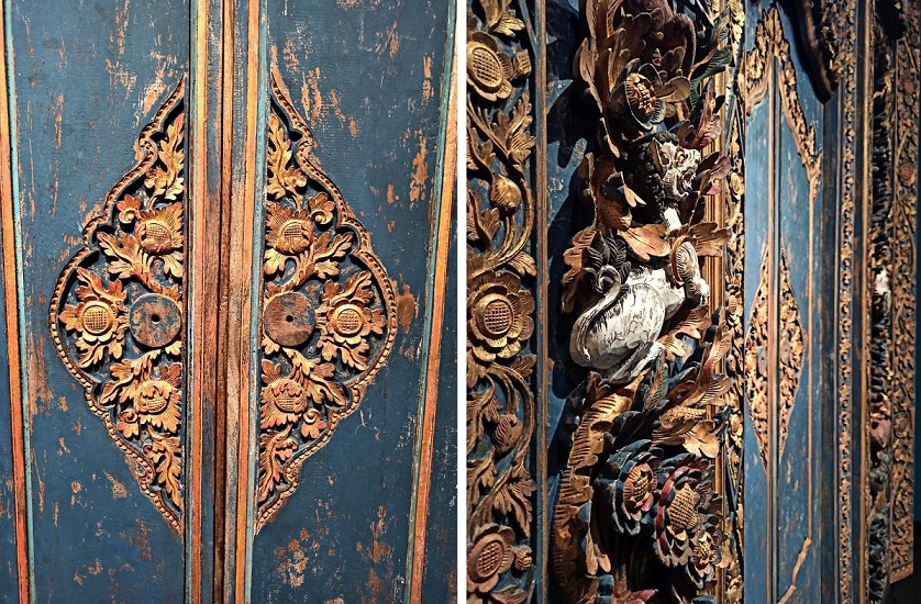 Ta część wystawy skupia się na Indonezji – największego kraju Azji Południowo-Wschodniej, obejmującego ok 18 000 wysp! To bez wątpienia najbogatsza i – moim zdaniem – najpiękniejsza kolekcja w całym muzeum. Zaprezentowane zostały tutaj liczne przykłady tradycyjnej broni, stroje indonezyjskie związane z klasycznymi tańcami balijskimi czy ceremonią ślubu czy zespół instrumentów orkiestry gamelanowej. Można podziwiać tu również liczne lalki wayang wykonywane z ażurowo wycinanej skóry, które wykorzystywane są w przedstawieniach teatru cieni, przepięknie zdobione maski oraz bogatą kolekcję tkanin batikowych. Jednak to, co całkowicie mnie oczarowało to tradycyjnie zdobione balijskie drzwi. Tak mnie urzekły, że długo nie mogłam oderwać od nich wzroku. Innym ciekawym eksponatem jest pendopo, czyli drewniany pawilon służący do koncertów klasycznej indonezyjskiej orkiestry oraz przedstawień teatru cieni. To właśnie tutaj stwierdziłam, że jednak chcę polecieć do dalekiej Azji i cieszyć oczy takimi pięknymi przedmiotami 🙂