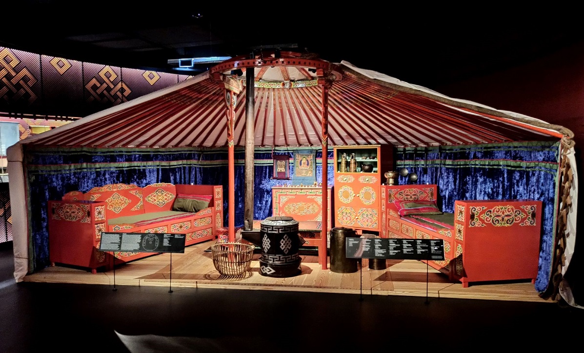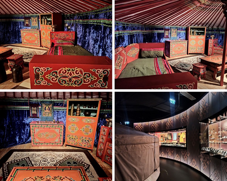 Dalej kierujemy się do Mongolii, do kraju na który w większości składa się step i półpustynia. Zamieszkują go ludy o charakterze koczowniczym, które borykają się z mroźnymi zimami, upalnymi latami, stałym i zimnym wiatrem z północny. W galerii poświęconej Mongolii można oglądać także artefakty związane z kowalstwem i innymi rzemiosłami, a także z obecnym tam buddyzmem i szamanizmem. W gablotach znajdują się przedmioty związane z życiem i wyznaniami koczowniczych ludów Mongolii. Zbiór mongolskich obiektów bogaty jest w biżuterię – naszyjniki, pierścienie i inne ozdoby, do których używano także turkusów, pereł, agatów, bursztynów i lapis lazuli. Jednak to, co najbardziej urzekło mnie w tej części wystawy, to tradycyjna mongolska jurta – kolisty, obszerny namiot, który jest składany i przenośny. Mongołowie słyną ze swojej gościnności i chętnie zapraszają do swego domu, ale niestety do tutejszej nie można było wejść i się rozgościć.
