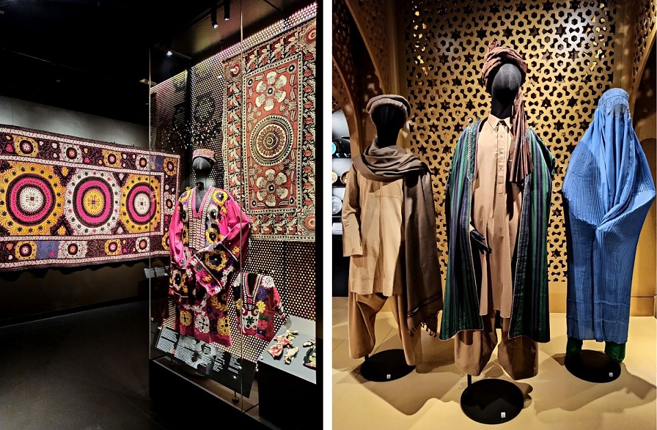 Drugim etapem zwiedzania jest przejście do Azji Centralnej. Z racji tego, że ten kawałek świata jest bliski mem sercu, nie będę ukrywać, że czekałam na tę część wystawy najbardziej. Galeria poświęcona kulturze Azji Centralnej, którą ukształtowały rdzenne społeczności koczownicze oraz wpływy perskie, hellenistyczne, chińskie, arabskie i rosyjskie. To prawdziwy miks kulturowo-religijny, ponieważ przenikały się tu także różne religie: lokalny szamanizm, buddyzm, zaratusztrianizm i islam sunnicki. Obiekty w tej części wystawy zachwycają bogatą kolorystyką i ornamentami. Zobaczyć tu możemy między innymi rękodzieło koczowników z Turkmenistanu, przykłady tkactwa, haftów i kobierców turkmeńskich, filce z Kazachstanu, Kirgistanu i Turkmenistanu wyróżniające się graficznymi korowymi wzorami, różnorodne przykłady ubiorów Kazachów, Kirgizów, Turkmenów i Afgańczyków (np. bogato zdobiona suknia dżumlo) oraz wyróżniające się bogactwem i bogatymi haftami stroje Uzbeków wraz z kolekcją tradycyjnych niskich czapeczek. To także pokaźny zbiór polichromowanych i glazurowanych naczyń ceramicznych (bardzo podobne mam w domu, które przywiozłam z Uzbekistanu:))