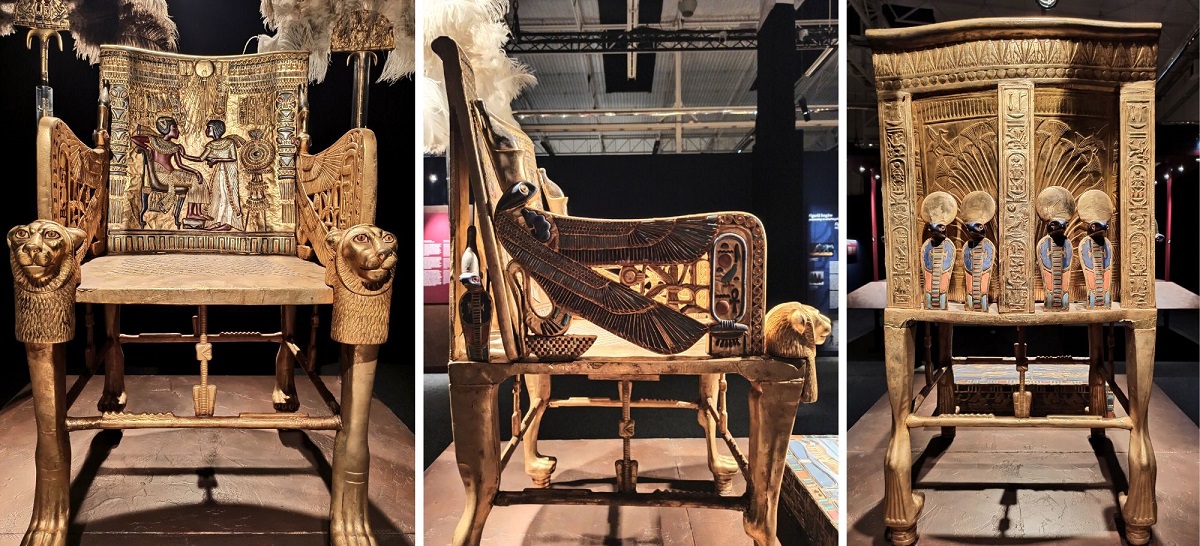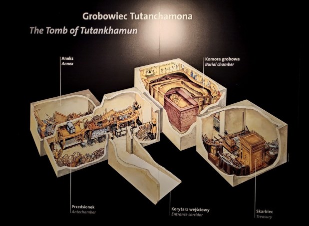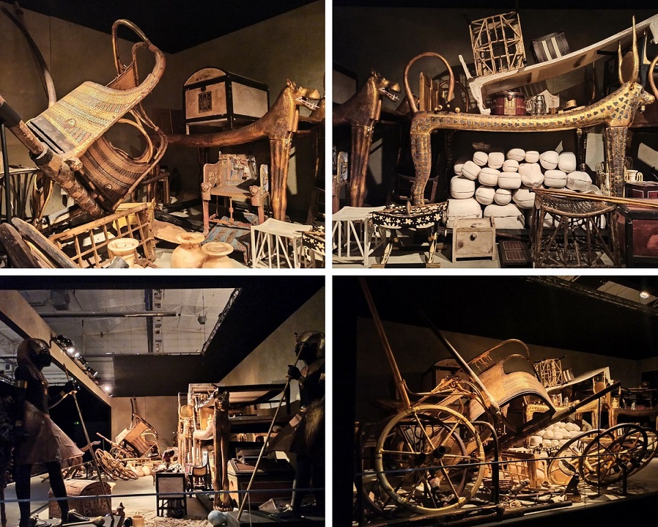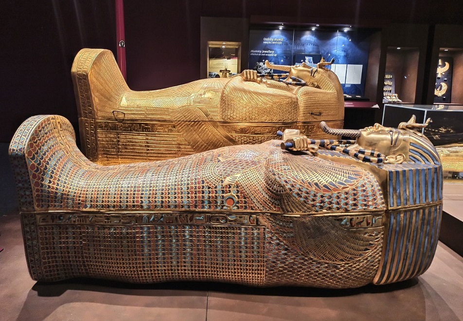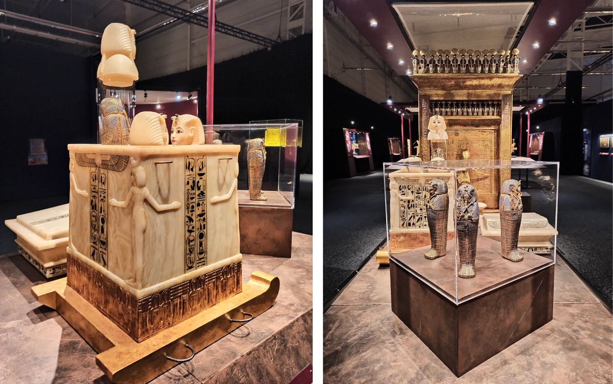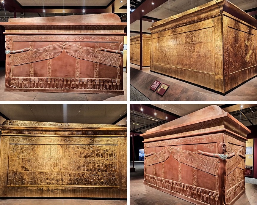 Wszystkie eksponaty to repliki. Chociaż z archeologicznego punktu widzenia są to falsyfikaty, to przyznaję, że wykonane są genialnie! Doskonale odwzorowanie oryginałów, dbałość o każdy detal i staranność wykonania aż bije po oczach. Wszystkie eksponaty zostały wykonane w tradycyjny sposób, z wykorzystaniem tradycji rzemieślniczej sprzed tysięcy lat, pod ścisłym nadzorem światowych egiptologów oraz przy pomocy najnowocześniejszych technologii stworzono doskonałe repliki wszystkich znalezisk, dzięki temu skarby grobowca można z bliska i co najważniejsze – zebrane w jednym miejscu, podziwiać na całym świecie. Trudno odróżnić replikę od oryginału. Osoby, które pracowały przy ich odtwarzaniu są prawdziwymi artystami! Faktycznie możemy poczuć się jak w grobowcu faraona 🙂