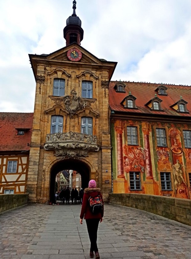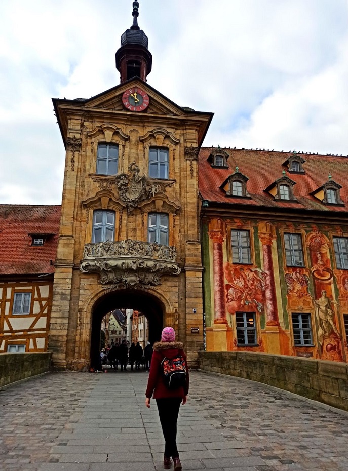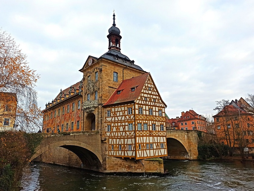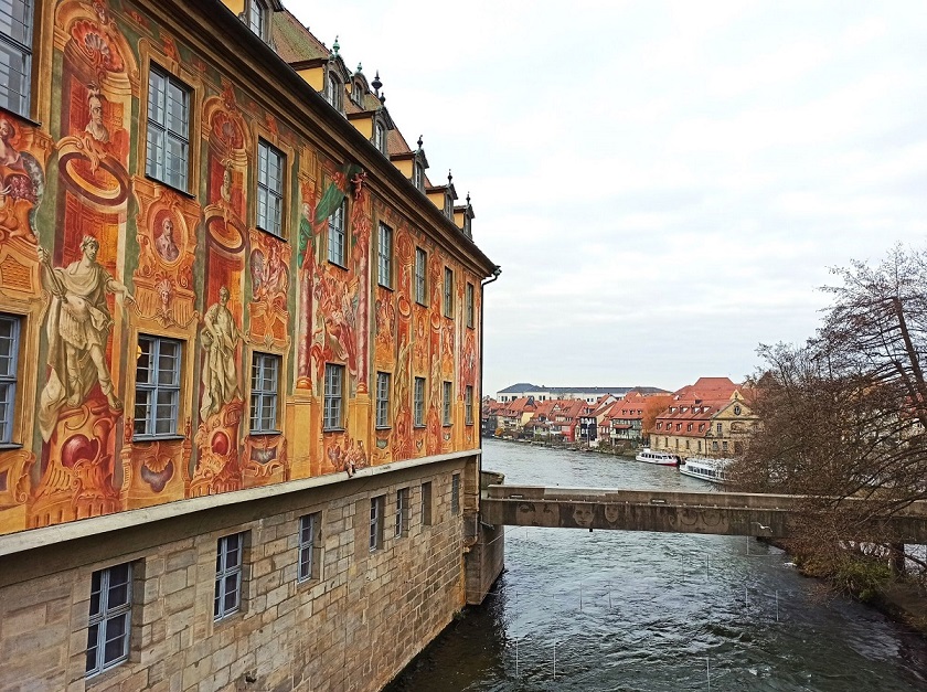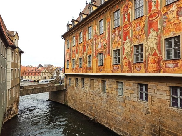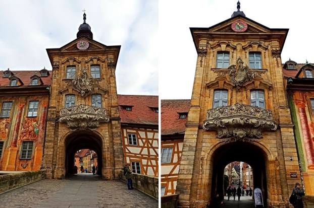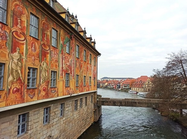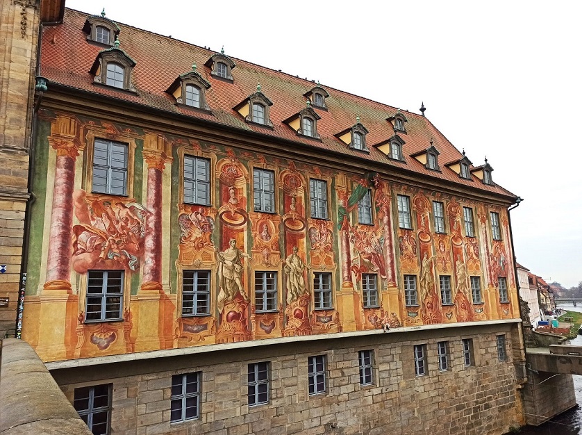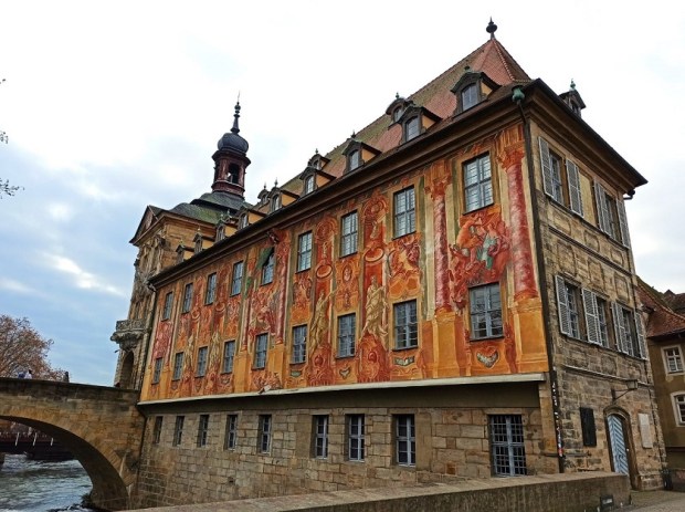 Razem z rzeką Regnitz, Ratusz oddzielał średniowieczne miasto na dwie części. Budowla powstała w drugiej połowie XV wieku na sztucznej wyspie pośrodku rzeki, chociaż dzisiejszy wygląd budynku jest w dużej mierze efektem przebudowy w stylu barokowym w połowie XVIII wieku. Z powstaniem sztucznej wyspy wiąże się pewna legenda – biskup odmówił przekazania choćby skrawka ziemi na budowę miejskiego magistratu, więc mieszkańcy sami ją sobie stworzyli, usypując na rzece wyspę. Budynek wyróżnia się ciemno-żółtawą drewnianą fasadą od strony południowej oraz cudownymi freskami na pozostałych częściach Ratusza. Co ciekawe, jeśli dobrze się przyjrzymy, po wschodniej stronie będziemy mogli wypatrzyć wystającą ze ściany nogę pulchnego cherubina 🙂