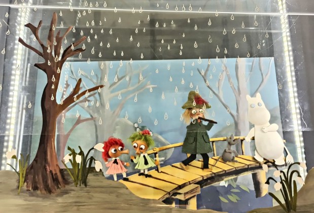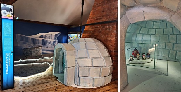 Wystawa znajduje się na przytulnym drewnianym strychu, gdzie każdy bohater ma własny pokój. Można zobaczyć, jak swoją budę urządził zaradny Reksio lub przenieść się na biegun polarny wprost do igloo sympatycznego Pingwina Pik-Poka. To jednak nie wszystko. Miłośnicy morskich wojaży mogą stanąć za sterem statku Bolka i Lolka, wyposażonego w prawdziwe liny okrętowe oraz koło ratunkowe. Jednak najchętniej odwiedzanym rezydentem tej części wystawy jest bez wątpienia Miś Uszatek. Możemy nie tylko zajrzeć do pokoiku sympatycznego niedźwiadka, ale również zobaczyć, co Uszatek trzyma w szafie. W pomieszczeniu stoi także łóżeczko ze słynną niebieską piżamką w kratkę, telewizor i oryginalna kukiełka misia z filmów realizowanych w Se-ma-forze. Niedaleko znajduje się jej powiększona replika w formie przytulanki. Uszatek szykuje się do spania, a tymczasem nieopodal nad Doliną Muminków wschodzi słońce. Zdjęcie z rodziną sympatycznych trolli wraz z Małą Mi to świetna pamiątka – wiem, co mówię. Co prawda Muminki wyglądają normalnie, tzn. tak jak w bajce, za mój ulubieniec Włóczykij ma „nieco” demoniczny wyraz twarzy, a Mała Mi wygląda, jakby nie spała od co najmniej tygodnia… 😀
